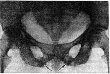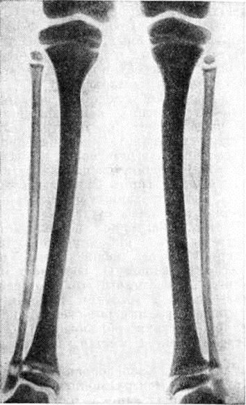 Метафизы длинных трубчатых костей утолщаются, приобретают чашеобразный вид, что обусловлено задержкой обызвествления остеоидных балок, образующихся вблизи зоны роста (рисунок 5). Дифференциальную диагностику Остеопатия нефрогенная у детей проводят с витамин-D-дефицитным рахитом (смотри полный свод знаний), гипофосфатазией (смотри полный свод знаний), несовершенным остеогенезом (смотри полный свод знаний: Остеогенез несовершенный), хондродистрофией (смотри полный свод знаний), мальабсорбции синдромом (смотри полный свод знаний), с идиопатической гиперкальциемией детского возраста (смотри полный свод знаний: Гиперкальциемия). При дифференциальной диагностике с рахитом имеет значение время возникновения изменений со стороны костной системы ребёнка. Клинические, проявления рахита обычно обнаруживаются рано, в возрасте 1½—3 месяцев и сопровождаются гипераминоацидурией (смотри полный свод знаний: Аминоацидурия) и метаболическим ацидозом. Гипофосфатазия проявляется также в первые месяцы жизни ребёнка и характеризуется пониженным содержанием или отсутствием щелочной фосфатазы в крови и повышенной экскрецией фосфоэтаноламина с мочой. Цистиноз (смотри полный свод знаний) по клинике и биохимическим сдвигам сходен с синдромом де Тони—Дебре—Фанкони; его диагностика основана на обнаружении кристаллов цистина в роговице и в лейкоцитах. Для синдрома Лоу (смотри полный свод знаний: Лоу синдром) характерно одновременное поражение глаз, центральная нервная система и повышенное выведение с мочой кетокислот. При хронический тирозинозе (смотри полный свод знаний)) имеет место гепатоспленомегалии, желтуха и геморрагический синдром. Для идиопатической гиперкальциемии характерен остеосклероз во многих костях скелета, в том числе в костях таза по краю вертлужных впадин, в лобной и основной костях черепа, лопатке. Уплотняются также тела позвонков, короткие кости запястья и предплюсны. В длинных трубчатых костях остеосклероз локализуется в основном в метафизах, имея или сплошной или лентообразный вид. Длинные трубчатые кости, особенно нижних конечностей, при этом бывают искривлены (рисунок 6). Общие принципы терапии Остеопатия нефрогенная включают мероприятия, улучшающие всасывание кальция и витамина D, активацию его в печени и почках и превращение в гормон (1а, 2, 5-дигидрокси-холекальциферол). Активация ферментативных систем, осуществляющих гидроксилирование витамина D, возможна при введении таких препаратов, как фенобарбитал. При отсутствии эффекта назначаются высокие дозы витамина D3 и его гидроксилированных форм; применяются большие дозы препаратов фосфора и кальция. Лечение проводят под контролем содержания фосфора в крови, активности щелочной фосфатазы и выведения кальция и фосфора с мочой. Оперативную коррекцию костных деформаций проводят не раньше, чем через 2 года после стойкой клинико-биохимической ремиссии. Профилактика Остеопатия нефрогенная у детей заключается в лечении основного заболевания. Чем раньше начато лечение, тем реже возникают показания к оперативной коррекции костных деформаций.