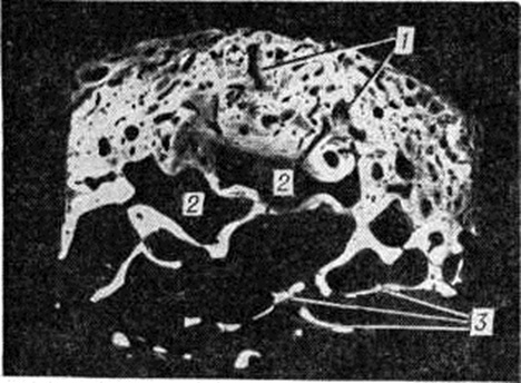 Развитие Остеопороз обычно оценивают визуально по плотности изображения кости на рентгенограмме. Однако так можно заметить лишь значительную (20—30%) потерю массы костного вещества, которая наступает, например, при переломе кости или остром инфекционные заболевании в среднем спустя 2—3 недель Для сопоставления на ту же плёнку делают снимок и симметричной части другой конечности. Очаговый Остеопороз на рентгенограмме имеет вид множества нечетко отграниченных участков разрежения костного вещества округло-овальной или полигональной формы (рисунок 3) размером в среднем 3—5 миллиметров в диаметром Между этими очагами костная ткань имеет обычное строение, корковое вещество не изменено или несколько разволокнено.