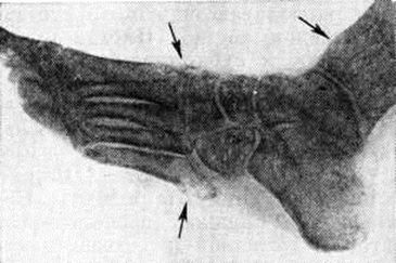 При острых артритах, травме и некоторых опухолевых поражениях костей встречается своеобразный Остеопороз в виде лентовидной полоски просветления губчатого вещества шириной в несколько сантиметров, пересекающей кость на месте эпифизарного хряща, — так называемый симптом Шинца.