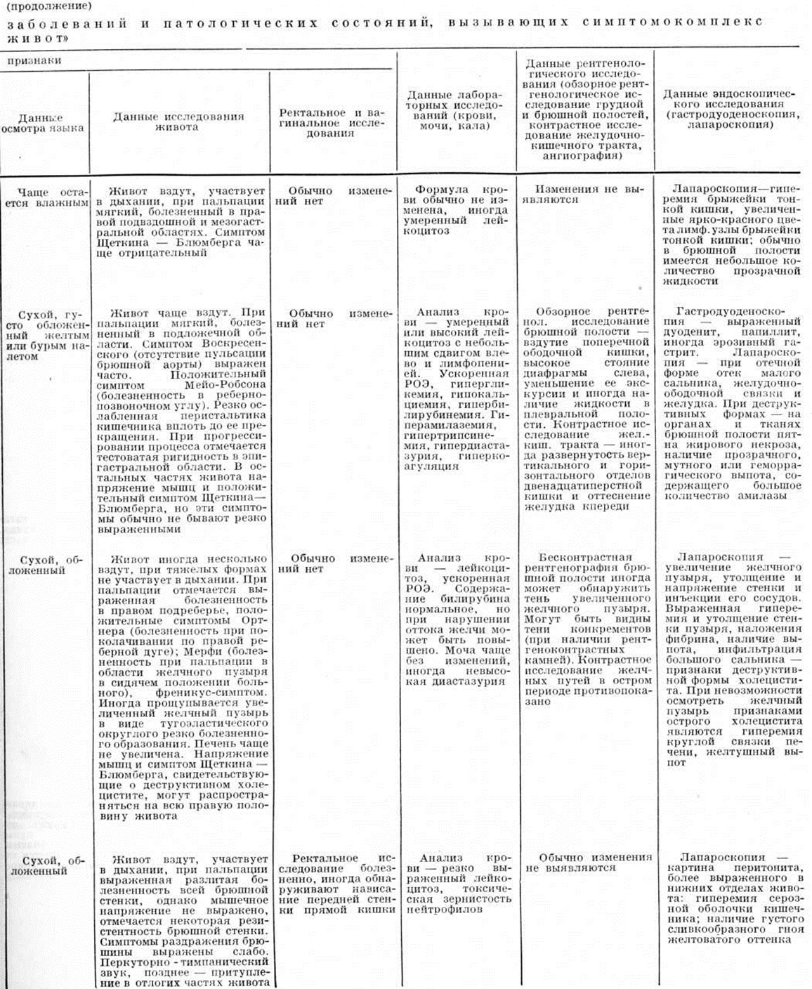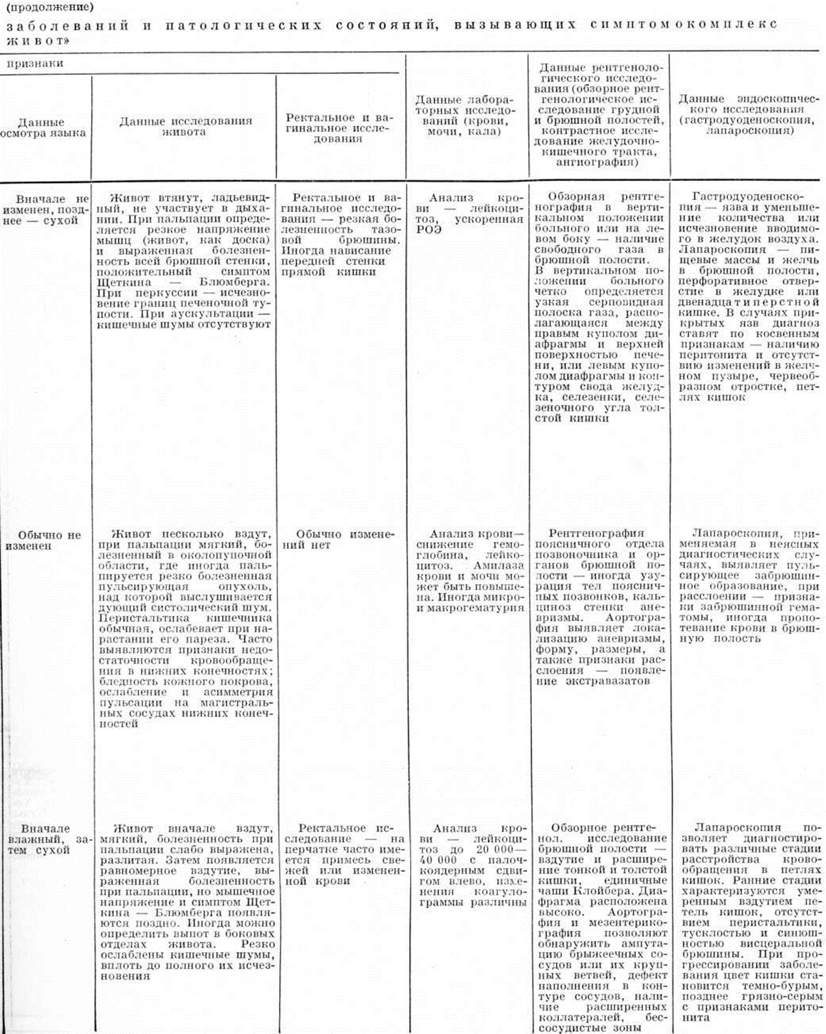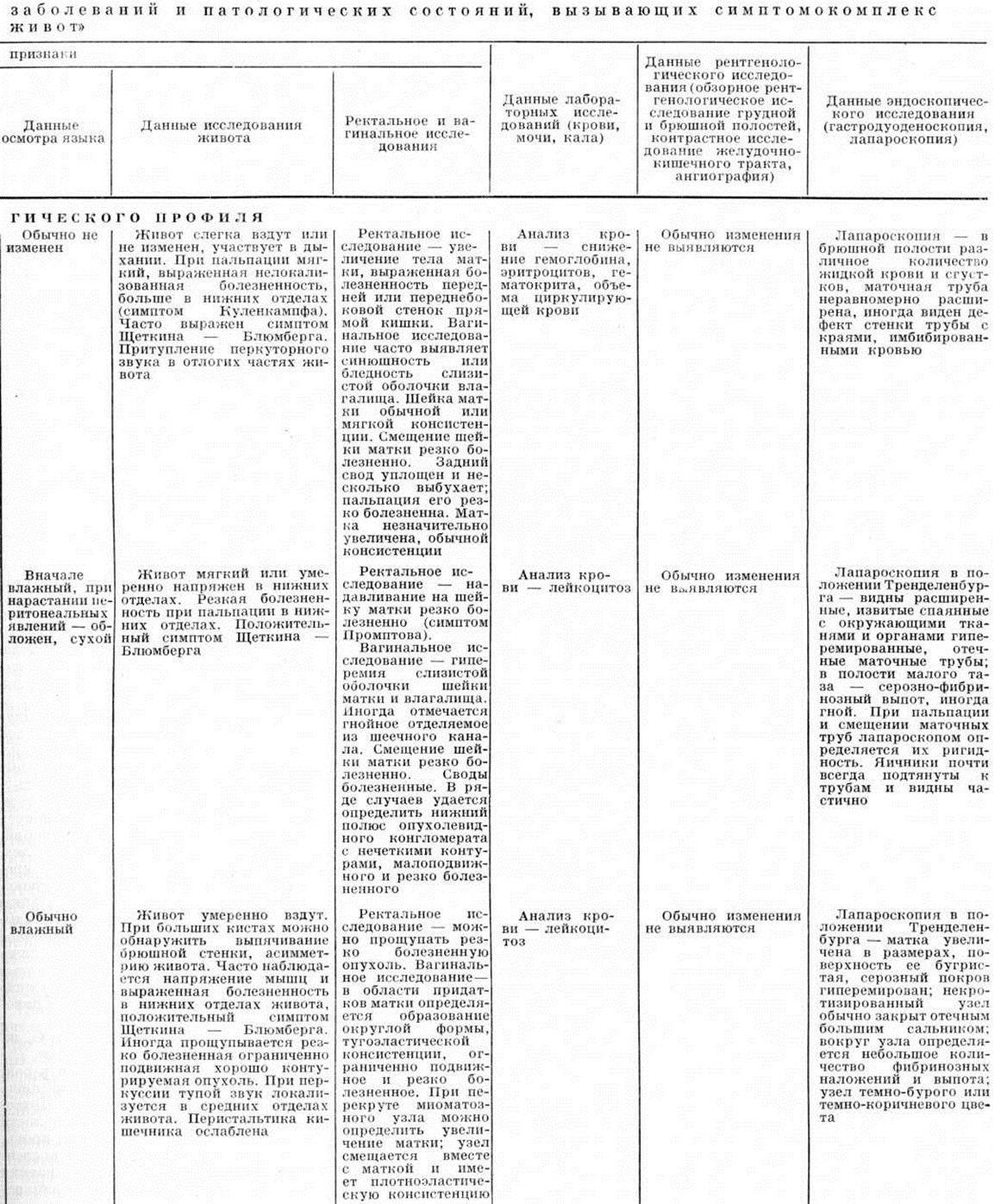 Перкуссия брюшной стенки позволяет обнаружить уменьшение границ или исчезновение печёночной тупости, что характерно для перфорации полого органа, а также наличие свободной жидкости в брюшной полости, наблюдаемое обычно при кровотечении, опухолях органов брюшной полости (карциноматоз брюшины), циррозе печени (асцит); выраженный тимпанит, обусловленный скоплением газов в кишечнике. Аускультация брюшной полости даёт возможность оценить характер перистальтики кишечника (по отсутствию кишечных шумов или их усилению), что позволяет заподозрить непроходимость кишечника. Ректальное исследование помогает обнаружить ряд заболеваний дистального отдела прямой кишки, патологический процессы в параректальной клетчатке, выявить симптом Промптова — резкая болезненность при пальпации шейки матки через прямую кишку (при острых воспалительных заболеваниях внутренних половых органов). Резкая болезненность передней стенки прямой кишки при ректальном исследовании свидетельствует о скоплении воспалительного выпота в полости малого таза. Снижение тонуса сфинктера заднего прохода и расширение ампулы прямой кишки (симптом Обуховской больницы)— характерный признак непроходимости кишечника. Влагалищное исследование, в том числе и инструментальное, позволяет оценить состояние внутренних половых органов и провести дифференциальный диагноз с острыми заболеваниями других органов брюшной полости. Лабораторные исследования помогают уточнить характер изменений, происходящих в организме, и оценить тяжесть состояния больного. Так, при анализе крови можно обнаружить высокий лейкоцитоз со сдвигом формулы влево (при воспалительных заболеваниях), снижение гемоглобина, количества эритроцитов, гематокрита (при внутренних кровотечениях) и так далее При тяжёлом состоянии больного, обусловленном желудочно-кишечные кровотечением или воспалительным процессом, применяют дополнительные методы исследования, например, определение центрального венозного давления, объёма циркулирующей крови, показателей кислотно-щелочного равновесия, водноэлектролитного баланса и так далее Рентгенологические исследование проводят по определённой методике: обзорная рентгеноскопия грудной и брюшной полостей, рентгенография брюшной полости в вертикальном, горизонтальном положении больного и латеропозиции (смотри полный свод знаний: Полипозиционное исследование). При тяжёлом состоянии больного исследование начинают с обзорных рентгенограмм грудной и брюшной полостей в горизонтальном положении больного на трохоскопе и в латеропозиции, причём необходимо достигать изображения обеих половин диафрагмы, боковых каналов брюшной полости и области малого таза. При рентгенологическое исследовании грудной полости изучают состояние лёгких, положение диафрагмы и степень её подвижности при дыхании. При ряде острых заболеваний органов брюшной полости (остром холецистите, остром панкреатите, перитоните) нередко появляются дисковидные ателектазы в базальных отделах лёгких и реактивный плеврит, обычно на стороне, соответствующей локализации поражённого органа. Только при разлитом перитоните, поздних стадиях механической непроходимости кишечника преобладают двусторонние изменения. На обзорных рентгенограммах брюшной полости, произведённых в вертика