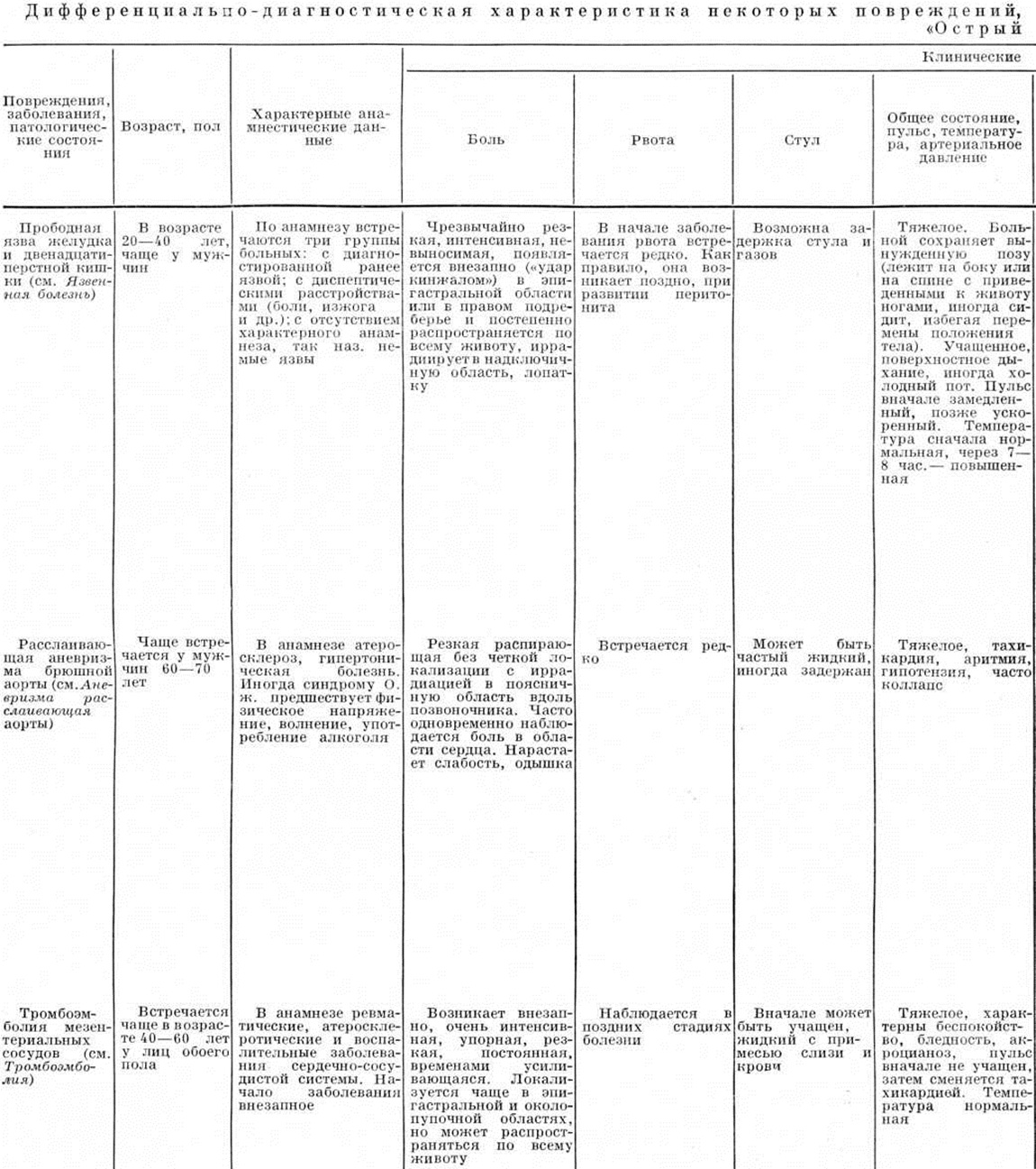Симптоматика и диагностические мероприятия. Ведущим симптомом практически во всех случаях Острый живот является боль, локализованная или по всему животу. Чёткой зависимости между динамикой заболевания, характером и интенсивностью боли, а также её локализацией обычно не наблюдается. При обширных и тяжёлых поражениях, обусловивших возникновение Острый живот (например, при некоторых видах механической непроходимости кишечника, распространённом геморрагическом панкреонекрозе), болевой синдром может быть резко выраженным и сопровождаться развитием шока (смотри полный свод знаний). Частый симптом Острый живот— рвота, которая может возникать в первые часы и даже минуты заболевания. Рвотные массы обычно состоят из остатков съеденной пищи, желудочного сока, желчи. Рвота, возникшая в более поздние сроки заболевания, как правило, бывает с примесью застойного содержимого, а в поздних стадиях заболевания принимает каловый характер. При желудочном кровотечении рвотные массы обычно имеют вид кофейной гущи или содержат алую кровь. Иногда наблюдается упорная мучительная икота, что обычно связано с раздражением диафрагмального нерва. Так называемый френикус-симптом (смотри полный свод знаний) обычно возникает вследствие раздражения воспалительным экссудатом, излившимся содержимым желудочно-кишечные тракта или кровью нервных окончаний на брюшине, покрывающей диафрагму. Такое же происхождение, очевидно, имеет и так называемый симптом ваньки-встаньки, при котором боли в животе резко усиливаются при попытке больного принять горизонтальное положение, в связи с чем он стремится сесть. Как правило, при Острый живот развиваются нарушения пассажа содержимого кишечника. Задержка стула и газов обычно связана с наличием механической или динамической непроходимости кишечника. Реже бывает жидкий стул (например, при инвагинации кишки). Важным симптомом Острый живот является изменение характера кала. Так, мелена (смотри полный свод знаний) характерна для желудочно-кишечные кровотечений, а примесь алой крови часто наблюдается при инвагинации кишки и острых нарушениях мезентериального кровообращения. Из диагностических мероприятий существенную роль играют изучение анамнеза заболевания и его осложнений, которые могут привести к возникновению симптомов Острый живот, а также сведения о наличии в прошлом приступов болей в животе, о характере и результатах проведённых в прошлом диагностических и лечебных мероприятий. Важные данные можно получить при осмотре больного и наблюдении за его поведением. Так, при повреждении органов брюшной полости, перитоните, внутреннем кровотечении характерно неподвижное положение в определённой позе (часто на боку с приведёнными к животу ногами), поскольку малейшее движение вызывает резкое усиление болей. При ряде патологический процессов, сопровождающихся периодическими схваткообразными болями в животе (например, при печёночной или почечной колике, некоторых формах непроходимости кишечника), больной может быть возбуждён, стонет, кричит, мечется. Часто характерно страдальческое выражение лица, а при разлитом перитоните, странгуляционной непроходимости кишечника — так называемый лицо Гиппократа (смотри полный свод знаний: Гиппократа лицо). При осмотре больного обращают внимание на форму живота