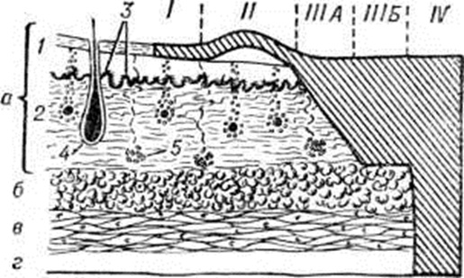 В СССР на XXVII съезде хирургов (1960) принята четырёхстепенная классификация, согласно которой ожоги I и II степени определяются, как и в предыдущих классификациях; ожоги III степени подразделяются на две группы — А и Б (при ожогах IIIА степени имеется частичный некроз кожи с сохранением камбиальных элементов дермы, при ожогах IIIБ степени некроз кожи распространяется на всю её толщу); ожоги IV степени характеризуются омертвением кожи и глубжележащих тканей (рисунок 1). Ожоги I, II и IIIА степени относят к поверхностным; кожный покров при них восстанавливается самостоятельно. Ожоги IIIБ и IV степени — глубокие; при них обычно требуется оперативное лечение. По тяжести поражения различают лёгкие, средней тяжести, тяжёлые и крайне тяжёлые Ожоги Статистика Из всех видов Ожоги чаще наблюдаются термические поражения кожи, реже — полости рта и дыхательных путей, ещё реже — пищевода и желудка. В мирное время среди взрослого населения Ожоги, полученные в быту и на производстве, распределяются примерно поровну, хотя на это соотношение влияют число и плотность населения, энергообеспеченность быта и ведущих отраслей народного хозяйства данного региона и другие По данным Н. И. Атясова (1970), Ожоги составляют 6% от числа травм мирного времени. По некоторым статистикам, ежегодно примерно 1 человек на 1000 населения получает термический ожог, причём от 8 до 12% пострадавших составляют люди пожилого и старческого возраста. В индустриально развитых странах термические Ожоги у детей составляют от 25 до 50% всех Ожоги, причём дети до 7 лет получают Ожоги в 2 раза чаще, чем дети школьного возраста. Химические Ожоги, по данным Б. Н. Постникова (1964), составляют 5—7%, а электрические Ожоги— 1,5— 2,5% всех ожоговых травм. Химические и электрические Ожоги у детей встречаются реже. Частота термических поражений в военное время по мере развития технического оснащения войск и совершенствования вооружения имеет тенденцию увеличиваться. Во время военных действий на реке Халхин-Гол обожжённые составили 0,3% раненых, а во время советско-финляндского конфликта — 0,79%. В период Великой Отечественной войны применение реактивного оружия и зажигательных смесей способствовало увеличению числа обожжённых как на поле боя, так и среди гражданского населения. Однако количество Ожоги в структуре санитарный потерь, как правило, не превышало 1%. В большинстве случаев (69,8%) Ожоги возникали в результате воздействия пламени при пожарах и возгорании бензина в боевой технике. С появлением ядерного оружия ожоговые травмы становятся одним из доминирующих видов поражения, о чем свидетельствует печальный опыт применения США атомного оружия в Японии. Только в Хиросиме было зарегистрировано около 40 000 обожжённых. Согласно данным Гласстоуна (S. Glasstone, 1957), 20—30% погибших от атомной бомбардировки в Хиросиме и Нагасаки составили обожжённые. После второй мировой войны в локальных войнах США широко применялся напалм. По данным ряда исследователей, среди раненых и больных, лечившихся в то время в некоторых госпиталях Корейской народной армии, 8—10% составляли пострадавшие от Ожоги напалмом. Аналогичные сведения приводятся и по Вьетнаму. Термические ожоги Термический Ожоги возникает в результате действия пламени, раскалённых металлов, горящих газов или жидкостей, лучистой энергии. Чаще всего поражаются поверхн