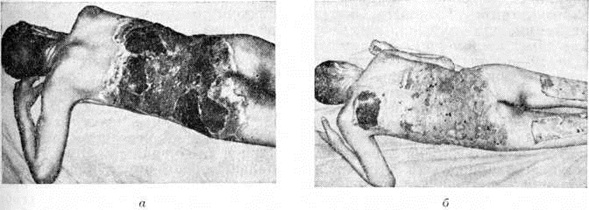 Осложнения. В ряде случаев можно лишь условно разграничить нарушения, являющиеся проявлением ожоговой болезни, и её осложнения. В разные сроки ожоговой болезни, чаще в периоды токсемии и септикотоксемии, может развиться очаговая, крупозная или долевая пневмония (смотри полный свод знаний). В первые дни это осложнение обычно связано с поражением органов дыхания продуктами горения. Физикальная диагностика пневмоний часто затруднена наличием Ожоги в области грудной клетки, поэтому особое значение приобретает рентгенологическое обследование. Изредка может наблюдаться инфаркт миокарда (смотри полный свод знаний), а в периоде септикотоксемии — перикардит (смотри полный свод знаний). Многообразны осложнения со стороны органов брюшной полости. Часто возникают острые язвы желудочно-кишечные тракта (смотри полный свод знаний Язвенная болезнь), нередко сопровождающиеся кровотечением или прободением (язвы Курлинга). Иногда развивается бескаменный язвенный или гангренозный холецистит (смотри полный свод знаний). Возможны и другие осложнения (тромбоз сосудов брюшной полости, острый панкреатит, острый аппендицит, острая кишечная непроходимость). Диагностика острого живота у обожжённых нередко затруднена, так как симптоматика осложняющего процесса может маскироваться проявлениями самой ожоговой болезни (парез кишечника, капилляротоксикоз и другие). В этих случаях гастроскопия (смотри полный свод знаний) и колоноскопия (смотри полный свод знаний) помогают уточнить диагноз. При выраженной ожоговой интоксикации может развиться печёночная недостаточность, токсический или сывороточный гепатит с преобладанием безжелтушных форм (смотри полный свод знаний Гепатит,, Гепатит вирусный). При этом наблюдается повышенная кровоточивость грануляций, билирубинемия, иногда ахолия кала. В поздние сроки после Ожоги возможно развитие нефрита, пиелита, пиелонефрита (смотри полный свод знаний), а при ожоговом истощении, которое само является осложнением периода ожоговой септикотоксемии, возможно образование мочевых камней (смотри полный свод знаний Почечнокаменная болезнь), развитие моно и полиневритов. К наиболее тяжёлым осложнениям ожоговой болезни относится сепсис (смотри полный свод знаний). К осложнениям местного характера в области термического поражения относятся фурункулёз, флегмоны, гнойные артриты, а также гангрена конечности при циркулярных Ожоги. Ожоги ушных раковин III степени нередко осложняются развитием хондритов. Последние могут быть также следствием образования пролежней в области ушных раковин при тяжёлом состоянии пострадавшего. При глубоких Ожоги свода черепа с поражением костей возможно развитие эпи и субдуральных абсцессов, часто протекающих бессимптомно, и менингита. Неполное восстановление утраченного в результате глубоких Ожоги кожного покрова и подлежащих тканей приводит к развитию ожоговых деформаций — контрактур (смотри полный свод знаний), подвывихов и вывихов (смотри полный свод знаний Вывихи), анкилозов (смотри полный свод знаний), а также длительно текущих трофических язв (смотри полный свод знаний). Наиболее часто возникают контрактуры (цветной рисунок 10—11). Диагноз распространённости и глубины местных поражений, а также периодов ожоговой болезни основывается на характерных клинические, при