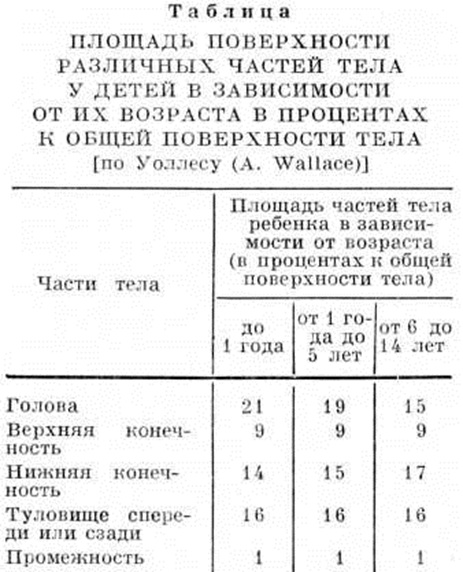 В противошоковой терапии нуждаются все дети с Ожоги на площади более 10%, а дети до 3 лет — более 3—5% поверхности тела. Наиболее интенсивная потеря и перераспределение жидкости в организме у детей наблюдается в первые 12—18 часов (особенно в первые 8 часов), поэтому инфузионных сред в первые 8 часов вводят в 2 раза больше, чем в остальные 16 часов суток. Расчёт суточного количества инфузионных сред, необходимых для лечения ожогового шока у детей, производят по формуле: 3 миллилитров X вес тела (кг) X площадь Ожоги (%). Половину этой дозы вводят в первые 8 часов Вначале внутривенно капельно вводят 0,1% раствор новокаина (от 30 до 150 миллилитров), рингер-лактатный раствор (лактасол), 4—5% раствор гидрокарбоната натрия, осмотические диуретики, к концу первых суток — альбумин, плазму, другие протеины. На следующие сутки целесообразна гемотрансфузия. Кроме того, через каждые 8—12 часов производят инъекции кардиотонических, обезболивающих, десенсибилизирующих средств и витаминов. По показаниям применяют гормоны и кровезаменители. Широко используют ингаляции увлажнённого кислорода. При отсутствии рвоты можно давать пить небольшими порциями щелочно-солевые растворы, минеральные воды (Боржом, Ессентуки № 20 и другие). Эффективность противошоковой терапии проверяют, как и у взрослых, главным образом по интенсивности диуреза. В зависимости от возраста ребёнка в норме диурез может составлять от 8—10 миллилитров в 1 час (у детей до 1 года) до 30—50 миллилитров в 1 час (у детей 11—14 лет). В период острой ожоговой токсемии, септикотоксемии и реконвалесценции больным переливают кровь, вливают сыворотку и плазму (по некоторым данным, наиболее эффективные от ожоговых реконвалесцентов), альбумин, низкомолекулярные дезинтоксикационные средства, сбалансированные солевые растворы. Необходимо постоянное введение витаминов С, группы В, гипосенсибилизирующих и жаропонижающих средств. Сразу после выхода ребёнка из шока начинают введение антибиотиков широкого спектра действия, а со времени нагноения раны антибиотики применяют с учётом чувствительности к ним микрофлоры. Для повышения реактивности организма назначают гамма-глобулин. Очень большое значение в лечении обожжённых детей имеет правильное, полноценное питание с достаточным количеством легко усвояемых белков, а также солей и витаминов. Местное лечение Ожоги осуществляют по тем же принципам, что и у взрослых. У детей может быть применена ранняя аутотрансплантация как на рану после некрэктомии (на 2—6-й день), так и на грануляции (3—4-я недель). При необходимости дополнительных пересадок кожи на грануляции их осуществляют через каждые 7—10 дней. Лучшие результаты даёт пересадка сетчатых кожных лоскутов толщиной 0,1 — 0,15 миллиметров. С целью профилактики контрактуры с первых дней лечения конечность должна быть уложена в положение разгибания, пальцы рук при Ожоги кистей должны быть слегка согнуты. Профилактика тугоподвижности осуществляется путём ранних и регулярных занятий лечебный физкультурой: детям дошкольного и школьного возраста показаны преимущественно активные движения, детям ясельного возраста — пассивные, пассивно-активные и рефлекторные упражнения в сочетании с массажем. После заживления ожогов у детей ещё длительное время продолжается структурная и функциональная, органная и системная 