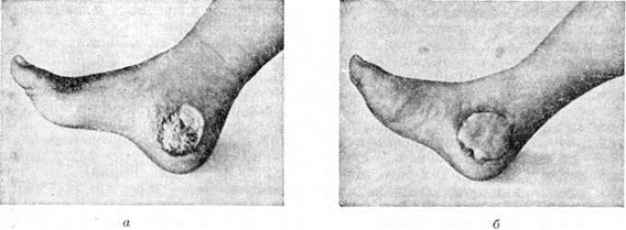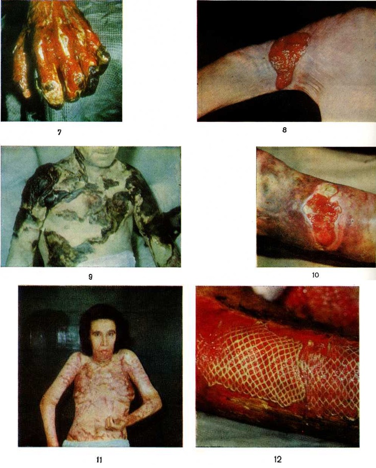 Оперативному вмешательству предшествует общее и интенсивное местное лечение, направленное на подавление возбудителей инфекции (повязки с гипертоническим раствором хлорида натрия, сульфаниламидами, антибиотиками). Из оперативных методов эффективен метод одномоментного иссечения поражённого участка с наложением первичных швов. Однако он возможен при ограниченных лучевых Ожоги, локализующихся на брюшной стенке, спине, бедре, то есть на местах, где в патологический процесс не вовлекаются крупные артерии, нервные стволы, сухожилия. В противном случае производят пересадку кожи на грануляции после подготовки их мазевыми повязками с солкосерилом, фторокортом и другие При этом лучший эффект достигается пересадкой кожно-подкожного лоскута на ножке, которую пересекают к концу 3-й недель При очень тяжёлых лучевых Ожоги конечности с обширным некрозом мягких тканей, с обнажением костей, секвестрацией сухожилий, а также при развитии гангрены показана ампутация (смотри полный свод знаний). В поздние сроки после лучевых Ожоги при длительно не заживающих лучевых язвах с наличием деформирующих рубцов производят их иссечение. Образовавшийся дефект закрывают с помощью пластики местными тканями, свободной пересадки кожи, филатовского стебля (цветной рисунок 17, 18), итальянской пластики (рисунок 11) или с помощью комбинированной пластики. На всех этапах оперативного лечения лучевых Ожоги проводят необходимую общую терапию пострадавшего: вводят анальгетики, антибиотики, витамины, переливают кровь и её препараты и другие Реабилитация пострадавших с лучевыми Ожоги проводится по тем же принципам, что и при термических ожогах. Прогноз в основном определяется площадью и глубиной поражения тканей. При прочих равных условиях тяжелее протекают лучевые Ожоги, вызванные гамма-нейтронным, чем бетаизлучением. Предшествующие заболевания, истощение, переутомление, снижающие резистентность организма к действию ионизирующего излучения, отрицательно сказываются на течении поражений. Особенно неблагоприятно протекают лучевые Ожоги на фоне лучевой болезни, когда нарушается кроветворение развивается геморрагический синдром и снижается общая сопротивляемость организма. По данным Хелда (Held, 1961), 30% лучевых язв склонны к малигнизации. Химические ожоги Хим. Ожоги вызываются крепкими неорганическими кислотами (азотная, серная, соляная, фтористо-водородная и другие), щелочами (едкий калий, едкий натрий, негашёная известь, каустическая сода), а также солями некоторых тяжёлых металлов (нитрат серебра, хлористый цинк, алюминийорганические соединения и другие). Чаще всего химический Ожоги поражаются открытые участки тела, однако при случайном приёме внутрь кислот и щелочей возможны Ожоги слизистой оболочки полости рта и пищевода. Под действием кислот изменяется состояние коллоидов клеток, происходит дегидратация и коагуляция тканей, наступает их гибель по типу сухого некроза. Щелочи при взаимодействии с белками образуют щелочные альбуминаты, омыляют жиры, что способствует развитию влажного некроза. Соли тяжёлых металлов по механизму действия стоят ближе к кислотам. Химических Ожоги, как и термические, подразделяются по глубине поражения тканей на четыре степени. Однако при химический ожогах II степени не образуются пузыри. Хим. Ожоги обычно быва