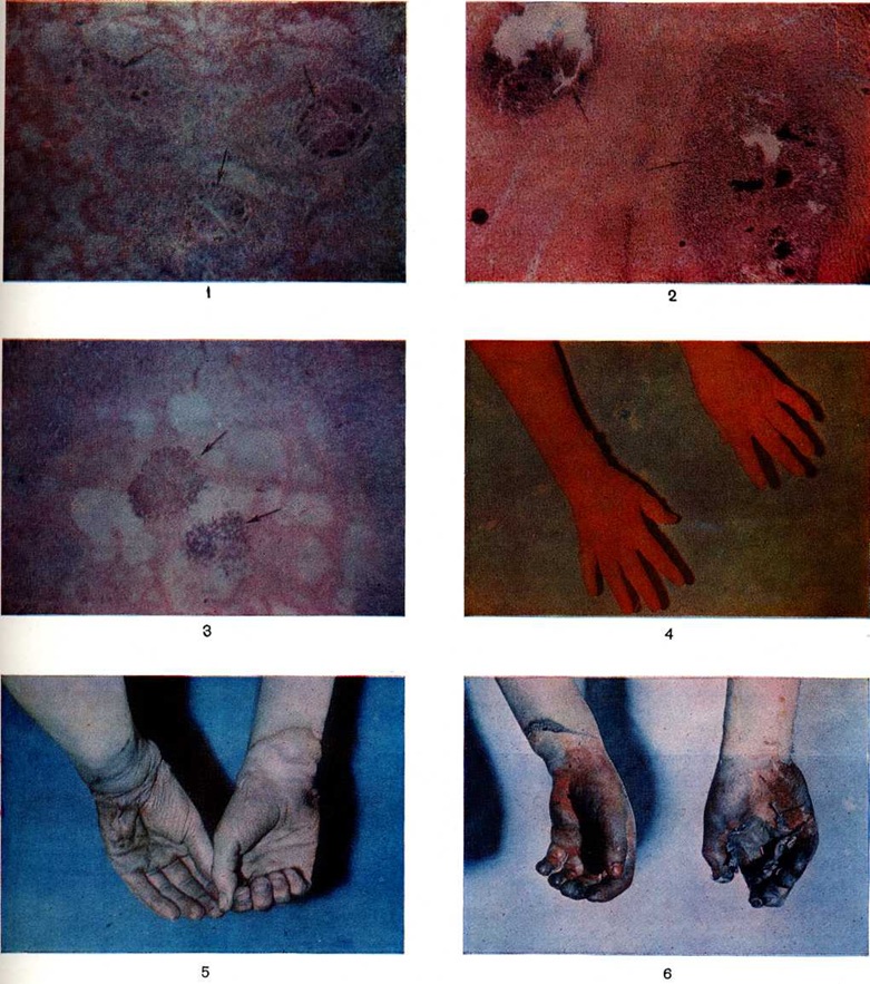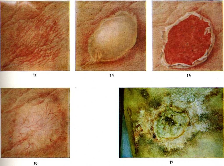Со стороны кроветворных органов и крови в периоде шока наблюдается угнетение миелопоэза, лимфопоэза, явления плазмоцитолиза и полнокровия лимфатических, узлов и селезёнки; в последней усилена поглотительная функция клеток ретикулоэндотелиальной системы и макрофагов, эритрофагия, блокада клеток ретикулоэндотелиальной системы дериватами гемоглобина и другими частицами. В периодах токсемии и септикотоксемии наступает гиперплазия лимфатических, узлов, пролиферация клеток лимфоидного и плазмоцитарного ряда. Электронно-микроскопические и авторадиографические исследования свидетельствуют о функциональный неполноценности лейкоцитов, макрофагов, плазматических клеток, деструкции их органелл, проявляющейся в незавершённом фагоцитозе и нарушении продукции глобулинов. При ожоговом истощении к этому присоединяются явления атрофии и очагового склероза иммунокомпетентных органов. В различных отделах желудочно-кишечные тракта, преимущественно в желудке и двенадцатиперстной кишке, иногда возникают множественные эрозии и острые язвы слизистой оболочки (рисунок 3). В основе их лежат нарушения микроциркуляции, тромботические процессы, кровоизлияния в слизистую оболочку, септические эмболии (рисунок 4). Чаще эрозивно-язвенные поражения развиваются в период септикотоксемии и особенно при явлениях ожогового истощения. В период септикотоксемии часто развиваются пневмонии, иногда как осложнение Ожоги дыхательных путей. В поздние периоды типичны бронхогенно-гематогенные диффузные воспалительные процессы (цветной рисунок 1). При развитии сепсиса (чаще всего стафилококкового или синегнойного происхождения), обычно протекающего по типу септикопиемии, метастатические абсцессы локализуются преимущественно в лёгких, почках, миокарде. Иногда встречается грибковый (кандидамикозный и аспергиллезный) сепсис с некротическими очагами в органах (цветной рисунок 3). Своеобразной формой ожогового сепсиса является эндотоксинемия, обусловленная дополнительной инвазией грамотрицательной микрофлоры через лёгкие, кишечник и так далее, в связи с деструкцией (на ультраструктурном уровне) аэрогематического, энтероцитарного (рисунок 5) и других гистогематических барьеров. Для ожогового истощения характерны резко выраженные дистрофические изменения органов и тканей, сопровождающиеся их атрофией и склерозом. На фоне этих изменений развиваются воспалительные (преимущественно гнойные) процессы. Клиническая картина. Местные изменения при Ожоги в начальном периоде клинически проявляются как серозное или серозно-геморрагическое воспаление — ожоговый дерматит, исход которого зависит от площади и глубины поражения и характера поражающего фактора. При ожоге I степени наблюдаются разлитая краснота и небольшая припухлость, появляющиеся через несколько секунд после Ожоги пламенем, кипятком, паром или через несколько часов при действии солнечных лучей (смотри полный свод знаний Дерматиты, дерматит солнечный). Отмечаются сильные жгучие боли в поражённом участке. Через несколько часов, чаще в течение 3—5 дней, эти явления проходят, повреждённый эпидермис слущивается и на месте Ожоги иногда остаётся небольшая пигментация. При ожоге II степени краснота, припухлость и боли выражены значительнее, чем при ожоге I степени. Пузыри образуются ср