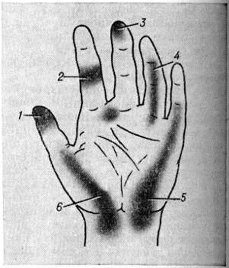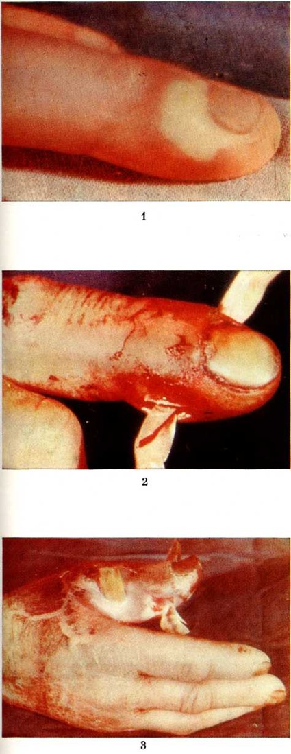 Пузырь окружён узким воспалительным валиком. Боль вначале незначительная, но по мере накопления гноя усиливается, становится постоянной, пульсирующей. Иногда очаг гиперемии вокруг пузыря расширяется, присоединяется лимфангиит (смотри полный свод знаний) и регионарный лимфаденит (смотри полный свод знаний), сопровождающийся повышением температуры тела до высоких цифр. Ранее подобное поражение называли лимфатическим панарицием. В современной хирургической литературе этот термин практически не употребляется. При кожном Панариций гнойный очаг в толще кожи может сообщаться с очагом в подкожной клетчатке — так называемый панариций в форме запонки (рисунок 1, 8). При околоногтевом Панариций— паронихии (смотри полный свод знаний) гнойное воспаление локализуется в толще валика ногтя: в боковом его участке, над корнем ногтя, или на всем протяжении валика (рисунок 1, 2). Кожа валика краснеет, припухает (цветной рисунок 1), из-под валика при надавливании появляются капли гноя. Подногтевой Панариций характеризуется скоплением гноя под телом ногтя (рисунок 1,5). Он возникает при инфицировании проникающих под ноготь колотых ран, нагноении подногтевых гематом или как осложнение паронихии; протекает остро. Ноготь приподнят, сквозь него просвечивает гной. Ограничение гнойного очага плотной ногтевой пластинкой обусловливает постоянную резко выраженную пульсирующую боль. Подкожный Панариций— воспаление подкожной клетчатки пальца (рисунок 1, 4) — наиболее распространённая форма Панариций Чаще встречается подкожный Панариций ладонной поверхности дистальных фаланг. Так как на тыльной поверхности пальцев кожа подвижная, а подкожная клетчатка рыхлая и содержит много лимфатических, сосудов, широко анастомозирующих с лимфатических, сосудами ладонной поверхности, то при расположении гнойного очага на ладонной поверхности пальца отёк, припухлость и гиперемия кожи более чётко выражены на боковых поверхностях и тыле пальца. Палец (или фаланга) увеличивается в объёме, становится напряжённым (цветной рисунок 2, 3). Большая толщина, плотность и неподатливость кожи ладонной поверхности, ячеистое расположение подкожной клетчатки способствуют быстрому распространению воспалительного процесса в сторону надкостницы и сухожилий. Боль постоянная, усиливается при разгибании и ослабевает при умеренном сгибании пальца. Точка наибольшей болезненности соответствует локализации центра гнойного очага. Часто больной лишается сна из-за боли, изнурён, температура тела повышается до 38—39°. В гнойное воспаление могут вовлекаться кость, сухожилия, суставы (рисунок 2). Из очага, локализующегося в проксимальной фаланге пальца, гнойный процесс может перейти по рыхлой клетчатке межпальцевых промежутков в каналы червеобразных мышц, дистальный отдел ладони и на проксимальные фаланги соседних пальцев (рисунок 3).