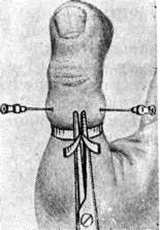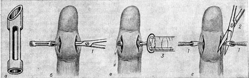 Костным Панариций называется гнойное воспаление пальца с вовлечением в процесс костной ткани (рисунок 1, 5). Различают костный Панариций дистальной, средней и проксимальной фаланг. Костный Панариций может быть первичным, возникающим в результате глубоких колотых ран и заноса инфекции в кость ранящим предметом. Эта форма встречается редко. Преобладает вторичный костный Панариций, причина которого — переход воспаления с мягких тканей на кость. Некроз и гнойное расплавление обусловливают возникновение дефекта кости или образование секвестров. Клинические, картина костного Панариций в ранней стадии не отличается от таковой при подкожном Панариций Вскоре все симптомы становятся резко выраженными. При поражении дистальной фаланги палец приобретает колбообразную форму с напряжённой, блестящей, гладкой кожей. Боль носит постоянный характер. Появляется озноб, головная боль, температура повышается до 39° и выше. В гнойный процесс могут вовлекаться сухожилия, суставы. Суставной Панариций характеризуется гнойным воспалением межфаланговых или пястно-фаланговых суставов (рисунок 1, 6). Различают две стадии течения суставного Панариций В I стадии в процесс вовлекаются только мягкие ткани сустава: появляется гиперемия кожи, отёк, сглаженность межфаланговых складок; палец приобретает веретенообразную форму. Толчкообразное давление по продольной оси пальца резко усиливает постоянную боль. При пункции сустава (смотри полный свод знаний: Суставы) можно получить мутную жидкость. Во II стадии разрушаются суставные хрящи, боковые связки, наступает деструкция костей, образующих сустав. Возникает патологический подвижность, вплоть до подвывиха в суставе, определяется крепитация суставных поверхностей. Может произойти самопроизвольное вскрытие такого Панариций, при этом образуется свищ с грануляциями и гнойным отделяемым. Сухожильный Панариций— гнойное воспаление влагалища сухожилия и сухожилия пальца (рисунок 1, 7). Воспаления сухожилий разгибателей пальцев, как правило, не бывает. Сухожилия сгибателей пальцев обычно вовлекаются в процесс вторично, воспаление переходит на них с влагалища сухожилий. Сдавление тонких сосудов, подходящих к сухожилию через мезотендиний, быстро накапливающимся во влагалище сухожилия экссудатом и тромбоз их приводят в короткие сроки к некрозу сухожилия. Гной из влагалища может прорваться наружу с образованием свища (рисунок 4). При сухожильном панариции I пальца гной может распространяться по влагалищу сухожилия длинного сгибателя большого пальца кисти в общее синовиальное влагалище сгибателей и к V пальцу. Возникает так называемый перекрёстный панариций. Возможно распространение гнойного процесса и в обратном направлении — от V пальца к I. Иногда процесс может перейти на глубокие слои предплечья — в так называемый пространство Пирогова—Парона. Этого не наблюдается при сухожильном панариции II, III и IV пальцев, влагалища сухожилий которых изолированы от общего синовиального влагалища сгибателей кисти. Основной признак сухожильного Панариций—постоянная боль по ходу сухожилия, усиливающаяся при попытке разгибания пальца. Несвоевременное хирургическое вмешательство влечёт за собой некроз сухожилия на большом протяжении, отторжение которого происходит очень медленно. Нежизнеспособное сухо