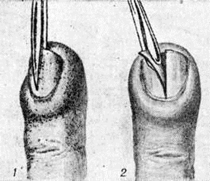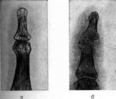 При костном панариции уже к концу 1-й недели болезни на рентгенограммах отмечается неравномерное просветление — реактивный остеопороз поражённой части фаланги вплоть до почти полного исчезновения структуры этой части фаланги при дальнейшем развитии Панариций (рисунок 6, а). По затихании воспаления очертания и структура фаланги восстанавливаются через 3—5 недель Ошибочное толкование этого просветления фаланги как некроза может привести к неоправданной резекции или даже экзартикуляции жизнеспособной фаланги. В отличие от описанной картины некротизированная часть фаланги, лишённая кровоснабжения, сохраняет на рентгенограммах тень нормальной интенсивности; образовавшийся секвестр часто смещается (рисунок 6, б). При интактности смежного сустава суставная щель и Подхрящевые корковые слои сохраняются. При осложнении костного Панариций гнойным артритом на рентгенограммах помимо остеопороза наблюдается прогрессирующее сужение суставной полости (вследствие хондролиза суставных хрящей), неровность и нечёткость контуров суставных концов (рисунок 7, а). Иногда гнойный артрит может осложниться дистензионным вывихом или подвывихом фаланги (рисунок 7, б). Суставной Панариций ведёт к анкилозу; при этом на рентгенограмме исчезают корковые слои суставных концов и суставная полость, на месте которой костно-трабекулярная структура переходит из одной кости в другую. При активно и длительно текущем костном или суставном Панариций может наблюдаться просветление всех смежных костей кисти (главным образом суставных концов костей), то есть регионарный остеопороз. При костном Панариций дистальной фаланги на рентгенограммах отсутствует оссифицирующий периостит вследствие малой активности здесь камбиального, остеогенного слоя надкостницы. Дифференциальная диагностика различных форм Панариций основывается на особенностях клинические, проявлений. Диагностика таких заболеваний пальцев, как фурункул (смотри полный свод знаний), карбункул (смотри полный свод знаний), обычно не сложна. Поражение пальцев возможно при туберкулёзе, актиномикозе, туляремии и др. Уточнение диагноза в таких случаях иногда представляет известные трудности и требует специальных бактериологических и серологических исследований, проводимых при соответствующих заболеваниях (смотри полный свод знаний: Актиномикоз, Гонорея, Сифилис, Туляремия и др.). Лечение. Основной метод лечения Панариций— оперативный. Консервативная терапия может быть эффективной лишь в начальной (серозно-инфильтративной) стадии. Однако комплекс консервативных мероприятий играет важную роль как дополнение к операции. Большое значение при этом имеет предоставление покоя поражённому пальцу и всей кисти, который достигается наложением гипсовой лонгеты на кисть и предплечье в функционально выгодном положении (смотри полный свод знаний: Гипсовая техника). Применяют горячие ванны для кисти и дистальной части предплечья, УВЧ-терапию, электрофорез с трипсином и другими ферментами, диадинамические токи, ультразвук, рентгенотерапию, иногда прибегают к местной гипотермии. По стихании острых явлений после операции применяют комплекс упражнений ЛФК. Особенно существенным компонентом комплексного лечения Панариций является антибактериальная терапия, мощным средством которой служат а