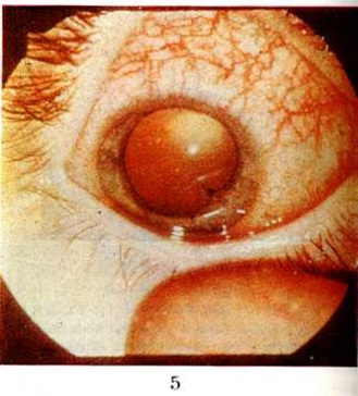 При Панофтальмит отмечаются резкая боль в глазу и в соответствующей половине головы, озноб, повышение температуры, иногда рвота. Наблюдаются гиперемия и отёк век, резко выраженный отёк конъюнктивы глазного яблока (хемоз), смешанная инъекция глазного яблока. При боковом освещении на дне передней камеры — гной, через 1 — 3 суток заполняющий всю камеру. Радужка гиперемирована, рисунок её стушёван. В начале заболевания при офтальмоскопии (смотри полный свод знаний), если она возможна, определяется расширение вен сетчатки, через 1—2 суток в стекловидном теле появляется гнойный экссудат (цветной рисунок 5).