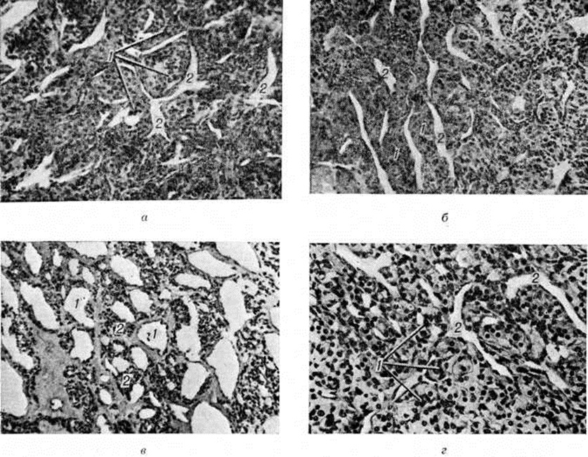 В толще клеточных тяжей встречаются мелкие полости с гомогенным содержимым, что расценивается как признак секреции. Трабекулы прилежат к сосудам, часто образуя фигуры так называемый розеток. Ангиоматозный вариант характеризуется обилием сосудов капиллярного и синусоидного типа, между которыми в хорошо развитой строме располагаются группы типичных для Параганглиома клеток (рис., в). Сосудов иногда так много, что возникают структуры, напоминающие кавернозную или капиллярную ангиому. Солидный вариант выделяют в связи с тем, что в его структуре преобладают пласты клеток со скудной стромой между ними (рис., г).