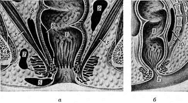 Характерным для анаэробного Парапроктит является быстрое распространение процесса, выраженная инфильтрация тканей, не всегда имеющая чётко определяемый центральный очаг воспаления. У больных наблюдается снижение АД, резкая тахикардия при умеренном повышении температуры тела. При преобладании в микробной флоре Вас. perfringens отмечается крепитация. Острый Парапроктит может иметь три исхода: выздоровление (если вскрытие гнойника сопровождается рубцеванием отверстия в стенке кишки, послужившего входными воротами инфекции), развитие хронически рецидивирующего Парапроктит, возникновение хронический Парапроктит с формированием свища прямой кишки. Неспецифический хронически рецидивирующий парапроктит проявляется периодически остро возникающим нагноением в околопрямокишечной клетчатке при отсутствии наружных свищей. Причиной рецидивов может быть не полностью закрывшийся дефект стенки кишки, через который происходит постоянное инфицирование околопрямокишечной клетчатки, или наличие в последней латентной инфекции. Рецидив может возникнуть также под влиянием провоцирующих факторов (травма, воспаление слизистой оболочки прямой кишки), когда нежный поверхностный рубец в области дефекта кишки нарушается и происходит повторное инфицирование клетчатки или активизация латентной инфекции. В промежутках между рецидивами возможна полная ремиссия. Хронический неспецифический парапроктит характеризуется наличием свища прямой кишки, который имеет внутреннее отверстие (в стенке кишки); встречается и несколько свищевых ходов и наружных отверстий. В стенке кишки и клетчаточных пространствах таза обнаруживаются перифокальные воспалительные и рубцовые изменения. В течение длительного времени единственным симптомом заболевания являются гноевидные выделения из наружного отверстия свища, которое может располагаться на коже промежности, ягодичной области, бедра, на стенке влагалища. По отношению к волокнам сфинктера прямой кишки различают свищи простые — интрасфинктерные (подкожные и подслизистые), транссфинктерные — чрессфинктерные и сложные — экстрасфинктерные (высокие). У 70% больных, страдающих свищами прямой кишки, в анамнезе отмечаются обострения воспалительного процесса, каждое из которых может повлечь за собой образование новых свищевых разветвлений, гнойных полостей, рубцовых изменений в стенке кишки и мышцах запирательного аппарата. Все это усложняет радикальное лечение хронический Парапроктит Из специфических парапроктитов некоторое значение может иметь сифилитический Парапроктит, встречающийся чрезвычайно редко. В отличие от острого неспецифического Парапроктит болезнь развивается медленно; вокруг прямой кишки образуется плотный неподвижный инфильтрат, суживающий её просвет. При распаде гуммы на стенке кишки образуется характерная гуммозная язва (смотри полный свод знаний: Сифилис). Ещё реже встречаются туберкулёзные поражения прямой кишки и окружающей клетчатки, актиномикоз и другие специфические заболевания этой области. Диагноз. Диагноз острого Парапроктит основывается на характерных клинические, данных. Значительную трудность может представить ранняя диагностика пельвиоректального Парапроктит, особенно если не помнить о нем как о возможной причине тяжёлого лихорадочного состоян