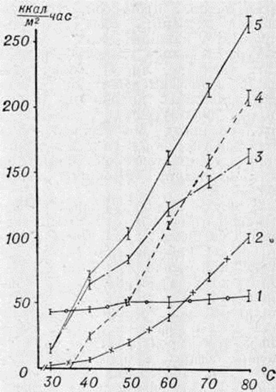 При повышении температуры поверхности тела, например, при затруднённом испарении пота, теплосодержание в организме может повышаться и при степени Перегревание организма, а температура тела может достигать 37,5°, происходит некоторое понижение АД (систолического и диастолического), лёгочной вентиляции, потребления кислорода и выделения углекислоты; минутный объем сердца повышается, пульс учащается на 15—20 ударов/минут; наблюдается гиперемия и увлажнение кожи. Общее состояние удовлетворительное, жалобы в основном сводятся к ощущению тепла, нередко отмечаются вялость и сонливость, нежелание работать и двигаться. степень Перегревание организма (так называемый частичное приспособление) возникает при температуре окружающей среды около 50°, при этом общая тепловая нагрузка уже не компенсируется испарением влаги, и накопление тепла в организме происходит вследствие прекращения отдачи в окружающую среду тепла, образующегося в организме. Температура тела может достигать 38,5°; систолическое давление повышается на 5—15 миллиметров ртутного столба, а диастолическое — снижается на 10— 20 миллиметров ртутного столба; минутный и систолический объем сердца, лёгочная вентиляция, количество поглощённого кислорода и выделенной углекислоты увеличиваются; пульс учащается на 40—60 ударов/минут наблюдаются резкая гиперемия кожи, профузное потоотделение, ощущение жары. степень Перегревание организма (так называемый срыв приспособления) наблюдается при воздействии высоких температур свыше 60°, при этом внешняя тепловая нагрузка преобладает над теплоотдачей испарением влаги с поверхности тела и дыхательных путей. Увеличение теплосодержания организма происходит вследствие затруднения отдачи тепла, образующегося в организме, и поступления его из окружающей среды. Температура тела может достигать 39,5—40°, систолическое давление повышается на 20—30 миллиметров ртутного столба, а диастолическое снижается на 30—40 миллиметров ртутного столба, может прослушиваться эффект «бесконечного тона» (нулевое диастолическое давление). Наблюдается относительное уменьшение систолического объёма сердца при продолжающемся учащении сердечных сокращений. У значительной части обследуемых (устойчивых к перегреванию), несмотря на снижение систолического объёма сердца, минутный объем продолжает увеличиваться за счёт учащения сердечных сокращений. Лёгочная вентиляция усиливается, количество поглощённого кислорода и выделенной углекислоты увеличивается. Пульс учащается вдвое и более по сравнению с исходной величиной, достигая в среднем 160 ударов/минут. Самочувствие ухудшается, что проявляется в ощущении сильной жары, сердцебиений, пульсации и давления в висках, нередко тяжести в голове и головной боли. Отмечается возбуждение, двигательное беспокойство; кожа резко гиперемирована, пот стекает каплями, наблюдается усиленный сердечный толчок, пульсация сонных и височных артерий. При IV степени Перегревание организма (так называемый отсутствие приспособления) предельное накопление тепла в организме может составлять в среднем 80 килокалорий на 1 м2 поверхности тела, или 2 килокалорий на 1 килограмм веса (массы) тела; у лиц, устойчивых к перегреванию, оно достигает 95—100 килокалорий на 1 м2 поверхности тела, или 2,3—2,5 килокалорий на 1 килограмм веса тела. При I