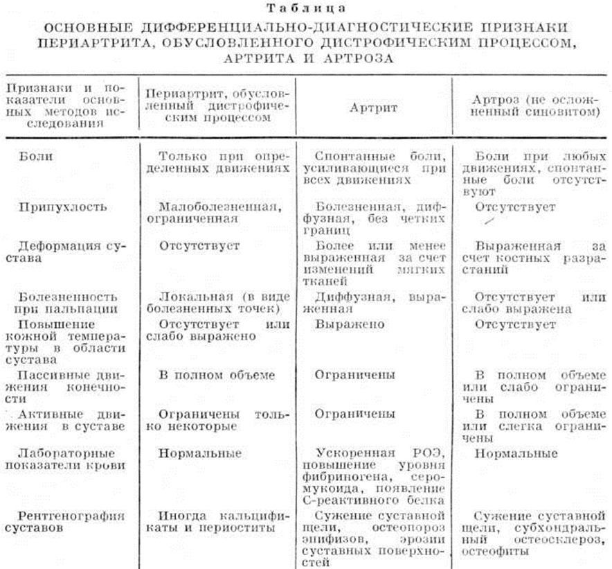Диагноз ставится на основании следующих симптомов: боль, возникающая только при определённых движениях, связанных с участием поражённого сухожилия, и безболезненность при выполнении других движений; ограниченная поверхностная припухлость в месте расположения синовиальной сумки или инсерции сухожилия; строгая локальная болезненность при пальпации (болезненные точки); ограничение только определённых активных движений, связанных с нагрузкой на поражённое сухожилие; нормальный объем пассивных движений (выполняемых с помощью врача); данные рентгенографии: при хронический течении Периартрит— небольшой периостит и остеопороз в месте прикрепления к кости поражённого сухожилия, а также утолщение и кальцификация мягких околосуставных тканей; интактность соответствующего сустава (иногда может быть сопутствующий остеоартроз). Вследствие локализации патологический процесса в непосредственной близости от суставных образований Периартрит иногда бывает трудно отличить от истинных заболеваний суставов. Основные дифференциально-диагностические признаки периартрита, обусловленного дистрофическим процессом, артрита и артроза приводятся в таблице. Лечение. При периартритах вследствие их склонности к хронический течению проводят длительное и настойчивое лечение, которое заключается в ограничении нагрузки на поражённое сухожилие, применении аналгезирующих и противовоспалительных средств, физиобальнеотерапии; иногда требуется оперативное вмешательство . Иммобилизация больной конечности достигается с помощью повязок, а в тяжёлых случаях — наложения гипса. Одновременно применяются обезболивающие и противовоспалительные средства (аспирин, анальгин, индометацин, бутадион, реопирин, бруфен в обычных терапевтических дозах). При выраженных болях показана инфильтрация поражённой области новокаином и гидрокортизоном. Инъекции повторяют через 5— 10 дней до уменьшения болей. При острейших болях проводят короткий курс глюкокортикостероидов внутрь (преднизолон 10—20 миллиграмм в день в течение 10—15 дней с последующим медленным снижением дозы на ¼ таблетки каждые 5 дней). Физические методы лечения должны применяться в самом начале заболевания. Фонофорез с применением гидрокортизона, микроволновая терапия, электрофорез лекарственных средств оказывают хорошее болеутоляющее действие, улучшают кровообращение. При хронический течении показаны сероводородные и радоновые ванны, при стихании болей — осторожная лечебный гимнастика (сначала пассивные движения); массаж противопоказан. При упорных болях применяется рентгенотерапия. Только при неэффективности всех методов консервативного лечения показано оперативное вмешательство (иссечение спаек с целью восстановления подвижности сухожилия, удаление шпор и прочее). Прогноз обычно благоприятный. При систематическом лечении происходит постепенное рассасывание очагов некроза и кальцификатов. Боль исчезает, подвижность конечности полностью восстанавливается. Однако при затянувшемся течении возможны остаточные явления вследствие фиброзных сращений околосуставных тканей, что ведёт к стойкому нарушению подвижности сустава.