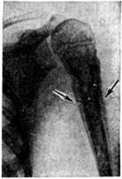 Периостит при других заболеваниях. При оспе описан Периостит диафизов длинных трубчатых костей с соответствующими утолщениями их, причём это явление наблюдается обычно в период реконвалесценции. При сапе отмечаются очаги ограниченного хронический воспаления надкостницы. При лепре описаны инфильтраты в надкостнице; кроме того, у лепрозных больных на трубчатых костях вследствие хронический Периостит могут образоваться веретенообразные вздутия. При гонорее наблюдаются воспалительные инфильтраты в надкостнице, при прогрессировании процесса — с гнойным отделяемым. Выраженный Периостит описан при бластомикозах длинных трубчатых костей, возможны заболевания рёбер после сыпного тифа в виде ограниченных плотных утолщений периоста с гладкими контурами. Локальный Периостит встречается при варикозном расширении глубоких вен голени, при варикозных язвах. Ревматические гранулемы костей могут сопровождаться Периостит Чаще всего процесс локализуется в малых трубчатых костях — пястных и плюсневых, а также в основных фалангах; ревматические Периостит склонны к рецидивам. Иногда при заболевании кроветворных органов, особенно при лейкемии, отмечают незначительный по размерам Периостит При болезни Гоше (смотри полный свод знаний Гоше болезнь) описаны периостальные утолщения преимущественно вокруг дистальной половины бедра. При длительной ходьбе и беге может возникать Периостит большеберцовой кости. Для этого Периостит характерны жестокие боли, особенно в дистальных частях голени, усиливающиеся при ходьбе и упражнениях и стихающие в покое. Местно видна ограниченная припухлость в связи с отёчностью надкостницы, очень болезненная при пальпации. Описан Периостит при актиномикозе. Рентгенодиагностика. Рентгенологические исследование выявляет локализацию, распространённость, форму, размеры, характер структуры, очертания периостальных наслоений, их взаимоотношения с корковым слоем кости и окружающими тканями. Рентгенологически различают линейные, бахромчатые, гребневидные, кружевные, слоистые, игольчатые и другого вида периостальные наслоения. Хронические, медленно текущие процессы в кости, особенно воспалительные, обычно вызывают более массивные напластования, как правило, сливающиеся с основной костью, что ведёт к утолщению кортикального слоя и увеличению объёма кости (рисунок 1). Быстро протекающие процессы ведут к отслоению надкостницы гноем, распространяющимся между ней и кортикальным слоем, воспалительным или опухолевым инфильтратом. Это можно наблюдать при остром остеомиелите, опухоли Юинга (смотри полный свод знаний Юинга опухоль), ретикулосаркоме (смотри полный свод знаний). Видимая в этих случаях на рентгенограмме линейная полоска новой кости, образованная надкостницей, оказывается отделённой от кортикального слоя полосой просветления (рисунок 2). При неравномерном развитии процесса таких полосок новой кости может быть несколько, в результате чего образуется картина так называемый слоистых («луковичных») периостальных напластований (рисунок 3). Гладкие, ровные периостальные наслоения сопровождают поперечную патологическую функциональный перестройку. При остром воспалительном процессе, когда под периостом скапливается гной под большим давлением, надкостница может разрываться, и на участках 