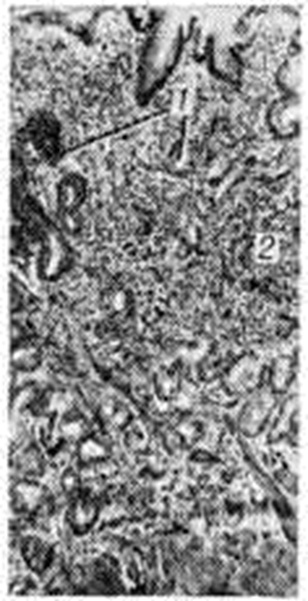 Патологическая анатомия. Смертельные случаи в связи с успешным лечением Пернициозная анемия встречаются крайне редко. При вскрытии умерших в остром периоде болезни выявляется общее малокровие, желтушность кожи, серозных и слизистых оболочек, жировая дистрофия миокарда, печени, почек. Кровь в сердце и крупных сосудах жидкая, водянистая. Вследствие выраженной гиперплазии кроветворных элементов и исчезновения жира костный мозг плоских костей, а также диафизов и эпифизов трубчатых костей очень сочный, малиново-красного цвета. Характерны атрофические изменения в желудочно-кишечные тракте. Сосочки языка, особенно в области корня, атрофичны, сглажены. Слизистая оболочка языка содержит красноватые участки воспаления, располагающиеся чаще по краям и на кончике, иногда афтозные высыпания, трещины (картина так называемый гунтеровского глоссита). Сходные изменения могут наблюдаться в слизистой оболочке дёсен, щёк, мягкого неба, глотки, пищевода. Постоянно выявляется атрофия слизистой оболочки желудка, наиболее выраженная в области дна; складки слизистой оболочки сглажены или не определяются, стенка желудка истончена, в некоторых случаях имеются полипозные разрастания. Атрофические изменения могут наблюдаться также в слизистой оболочке кишечника. Размеры селезёнки — в пределах или несколько больше нормы. Печень увеличена незначительно, плотновата. Вследствие отложения гемосидерина ткань селезёнки, печени, иногда почек на разрезе имеет ржавый оттенок. Лимф, узлы небольшие, мягкие. В некоторых случаях макроскопически в спинном мозге выявляются мелкие очаги некроза с размягчением. Иногда находят мелкоточечные кровоизлияния в серозных и слизистых оболочках, в коже. Микроскопически в красном костном мозге отмечается выраженная гиперплазия клеток эритроидного ряда с наличием среди них большого количества мегалобластов — крупных клеток, имеющих нежно-ячеистую структуру ядра с отчётливо видимыми ядрышками и широкую зону базофильной или полихроматофильной цитоплазмы. Число клеток лейкоцитопоэза несколько снижено. Мегакариоциты содержатся в достаточном или уменьшенном количестве. Наблюдаются выраженные дистрофические изменения и распад клеток, особенно эритроидного ряда, обилие эритро и сидерофагов. В слизистой оболочке желудка выявляется картина атрофического гастрита, имеется значительное уменьшение количества желёз и железистых клеток, особенно обкладочных. Клетки уменьшены в размерах, пикнотичны, уплощены, вследствие чего просвет желёз расширен. Возрастает количество слизеобразующих железистых клеток, встречаются участки кишечной метаплазии поверхностного эпителия. Строма слизистой оболочки склерозирована, инфильтрирована лимфоцитами, плазматическими клетками, единичными сегментоядерными нейтрофильными гранулоцитами (рисунок). Изменения наиболее выражены в дне желудка, однако интенсивность их может варьировать в различных участках слизистой оболочки. Атрофические изменения не подвергаются обратному развитию при лечении витамином В12 и сохраняются в период ремиссии заболевания. При биопсии слизистой оболочки тонкой кишки выявляются укорочение кишечных ворсинок, дистрофические изменения железистых клеток со снижением в них фигур митозов в криптах, лимфоидноплазмодитарная инфильтрация стром