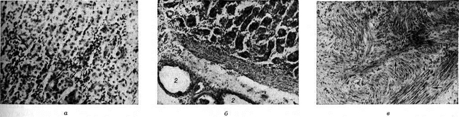 В мышечных слоях отмечается очаговая или диффузная гипертрофия мышечных волокон с увеличением размеров их ядер и вакуолизацией цитоплазмы (рисунок 1, в) в сочетании с гиперплазией эластических волокон вокруг них. Число ганглиозных клеток в нервных сплетениях желудка уменьшено, в ядрах их наблюдается дистрофия. Клиническая картина. Выделяют три фазы развития приобретённого Пилоростеноз: компенсации, субкомпенсации и декомпенсации. В фазе компенсации Пилоростеноз отмечаются жалобы на чувство полноты в эпигастрии после еды, периодическую рвоту. В фазе субкомпенсации наблюдается постоянное чувство тяжести в эпигастрии, отрыжка «тухлым», обильная рвота, видимая на глаз перистальтика. Натощак из желудка откачивается большое количество содержимого с примесью накануне съеденной пищи с признаками гнилостного брожения. Для фазы декомпенсации характерны тяжёлые нарушения общего состояния, большая потеря веса, обезвоживание организма (смотри полный свод знаний), гипопротеинемия, гипокалиемия (смотри полный свод знаний), азотемия (смотри полный свод знаний), алкалоз (смотри полный свод знаний). В далеко зашедших случаях вследствие прогрессирования нарушений водноэлектролитного баланса, резко выраженной гипохлоремии (смотри полный свод знаний) и гипокальциемии (смотри полный свод знаний Тетания) развивается судорожный синдром (так называемый желудочная тетания). Рвота при этом может отсутствовать. Видны контуры переполненного желудка, постоянно определяется шум плеска. При зондировании удаляется большое количество гниющих пищевых масс. Диагноз устанавливают на основании характерного симптомокомплекса, результатов зондирования желудка, гастроскопии, рентгенологическое данных и изучения моторной функции желудка. Важную роль в диагностике Пилоростеноз играет гастроскопия (смотри полный свод знаний), с помощью которой можно определить причину заболевания (язва, опухоль, рубец), а также точно установить диаметр суженного привратника. Задача рентгенологическое исследования сводится к обнаружению Пилоростеноз, уточнению его происхождения и оценке степени компенсации стеноза. Для более плотного заполнения пилорического отдела контрастной массой необходимо прибегать к полипозиционному исследованию, в частности к латероскопии (смотри полный свод знаний Полипозиционное исследование). Облегчает диагностику и двойное контрастирование желудка — барием и воздухом. В целях дифференцирования органического сужения привратника и пилороспазма (смотри полный свод знаний) используют фармакологических пробы. Сужение, вызванное злокачественной опухолью, имеет ригидный характер, контуры его неровные с дефектами наполнения. При Пилоростеноз другой этиологии контуры сужения гладкие, наблюдается изменчивость суженного участка на серийных снимках. В фазе компенсации Пилоростеноз желудок нормальных размеров или несколько увеличен, эвакуация не задержана или длится 8—12 часов, перистальтика его глубокая, усиленная. В фазе субкомпенсации желудок увеличен в размерах, натощак содержит жидкость, перистальтика ослаблена, опорожнение задерживается до 24 часов Декомпенсация проявляется расширением желудка, который содержит много жидкости, слизи, остатков пищи, гипотоничен, вследствие чего контрастная масса опускается на дно ж