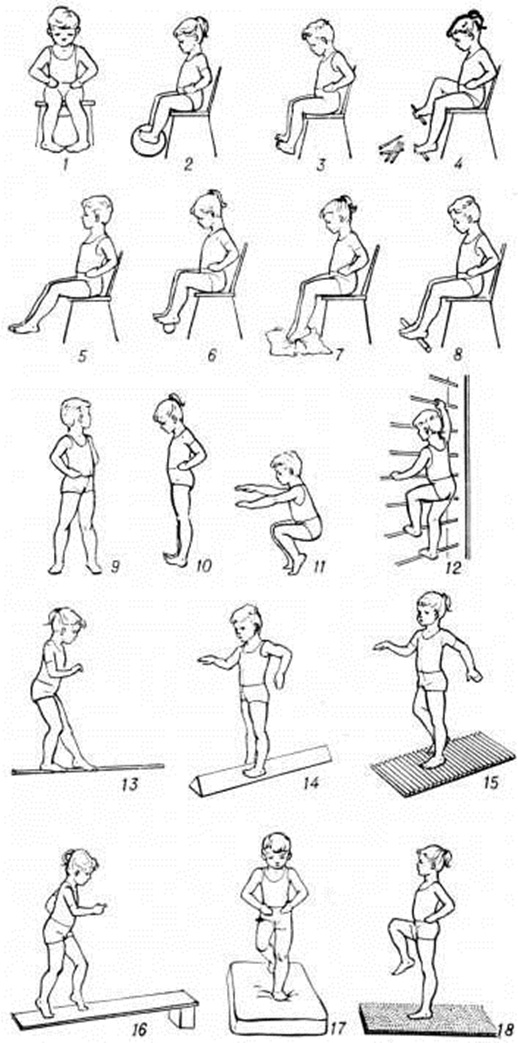 Рис. 3. Комплекс упражнений, рекомендуемых при плоскостопии: из исходного положения сидя на стуле (I—8); из исходного положения стоя (9—18) 1 — разведение и сведение пяток, не отрывая носков от пола, 2 — захватывание стопами мяча и приподнимание его, 3 — максимальное сгибание и разгибание стоп, 4 — захватывание и приподнимание пальцами ног различных предметов (камешков, карандашей и другие), 5 — скольжение стопой вперёд и назад с помощью пальцев, 6 — сдавливание стопами резинового мяча, 7 — собирание пальцами ног матерчатого коврика в складки, 8 — катание палки подошвами, 9 — повороты корпуса при фиксированных ногах, 10 — перекат с пятки на носок и обратно, 11 — полуприседания и приседания на носках, руки в стороны, вверх, вперёд, 12 — лазание по гимнастической стенке (на перекладины стенки стопы ставят средней частью), 13 — ходьба по гимнастической палке, 14 — ходьба по брусу с наклонными поверхностями, 15 — ходьба по ребристой доске, 16 — ходьба на носках вверх и вниз по наклонной плоскости, — ходьба по поролоновому матрацу, — ходьба на месте по массажному коврику.