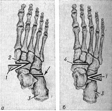 При продольном статическом Плоскостопие оперативное вмешательство применяют редко. Наиболее рациональна костно-пластическая операция Лертеса (рисунок 5). Обезболивание общее или внутрикостное. После операции накладывают гипсовую повязку сроком до 4—5 недель в положении лёгкой гиперкоррекции. Далее применяют лечебный гимнастику, массаж, физиотерапию, ортопедическую обувь.
