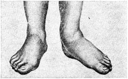 Паралитическое плоскостопие (рисунок 8) образуется при параличе мышц, поддерживающих своды стопы, наиболее часто после полиомиелита (смотри полный свод знаний). В лёгких случаях рекомендуют ортопедические ботинки. При нефиксированной деформации у детей, начиная с 5-летнего возраста, производят пересадку длинной малоберцовой мышцы на внутренний край стопы. Для удержания пятки от вальгусного отклонения показан внесуставной артродез таранно-пяточного сустава по Грайсу (рисунок 9).