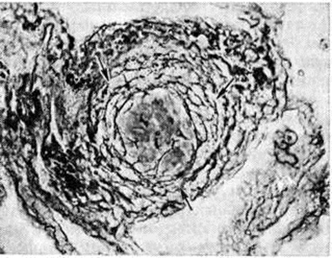 При силикозе и антракосиликозе в лёгких и регионарных лимфатических, узлах присутствуют типичные клеточнофиброзные и фиброзные узелки с концентрическим расположением коллагеновых и аргентофильных волокон (рисунок 1). Для силикатозов, особенно асбестоза, наряду с преобладанием интерстициального фиброза, захватывающего Межальвеолярные перегородки (фиброзирующий альвеолит), типично нахождение в лёгочной ткани особых телец (асбестовых, слюдяных и другие). Для антракоза характерно массивное скопление угольной пыли в лёгких, так называемый антракотические узелки, реже — узлы с пучкообразным расположением соединительнотканных волокон, с перибронхиальным и периваскулярным межуточным склерозированием и мелкоочаговой эмфиземой вокруг отдельных очажков. Количество угольной пыли в лёгких при антракозе может достигать значительных величин: у шахтёров, много лет проработавших под землёй, иногда обнаруживалось до 200 грамм угольной пыли в лёгких. При антракозе лёгкие могут быть окружены спайками чёрного цвета. Изменения в самой лёгочной ткани представляют собой сочетание краевой буллезной эмфиземы (смотри полный свод знаний Эмфизема лёгких) и диффузно-очагового пневмосклероза (смотри полный свод знаний). В очагах пневмосклероза определяются отложения пыли чёрного или серо-чёрного цвета. Бронхи расширены, встречаются бронхоэктазы (смотри полный свод знаний). Расстройство циркуляции крови и микроциркуляции в крупных очагах скопления пыли ведёт к дистрофическим и некротическим изменениям в лёгочной ткани с образованием антракотических каверн (смотри полный свод знаний Каверна). Развивается так называемый неспецифическая лёгочная чахотка (чёрная чахотка, phthisis atra). Узелки и узлы при антракозе могут сливаться друг с другом, занимая по площади долю лёгкого, чаще — нижнюю (опухолевидная форма антракоза). Регионарные лимфатических, узлы уплотнены, увеличены, чёрного цвета, реже поражаются шейные и забрюшинные лимфатических узлы. Скопления угольного пигмента иногда обнаруживаются в трахее, гортани, селезёнке, печени, почках. При микроскопическом исследовании эпителия трахеи и бронхов отмечают укорочение ресничек до их полного исчезновения и метаплазии эпителия в многослойный плоский. Атрофический, склерозирующий бронхит сопровождается нарушением выделительной функции мукоцилиарного тракта, что способствует большему накоплению пыли в лёгких. Более патогенная пыль антрацита вызывает выраженную реакцию «отграничения» и диффузный склероз лёгочной ткани. В антракотические узлы и регионарные лимфатических, узлы при антракозе часто происходит отложение извести. Истинный кальциноз лёгких при Пневмокониозы, при которых известь откладывается в склерозированных межальвеолярных перегородках и в фиброзных участках лёгочной ткани, следует отличать от кальциноза при нарушении функции паращитовидных желёз (смотри полный свод знаний Кальциноз) и от лёгочного альвеолярного микролитиаза. При вдыхании пыли металлического алюминия и содержащих его соединений и сплавов может развиться алюминоз, который приводит к выраженному склерозу лёгочной ткани и эмфиземе лёгких. Пневмосклероз при алюминозе поражает обычно верхние, доли обоих лёгких, которые, как правило, окружены спайками. Уплотнения в лёгких темно-серого цвета с сер