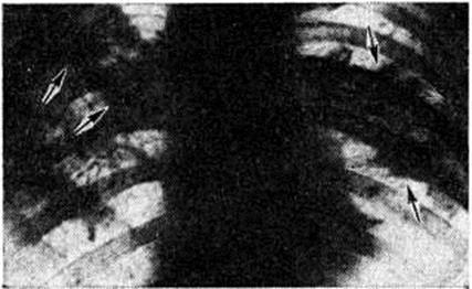 Диссеминированному процессу при Пневмокониозы обычно сопутствует расширение и уплотнение корней лёгких и адгезивная плевральная реакция. Дифференциальный диагноз следует проводить между Пневмокониозы и диссеминированными процессами в лёгких непылевой этиологии — с саркоидозом (смотри полный свод знаний), туберкулёзом органов дыхания (смотри полный свод знаний), Хаммена — Рича синдромом (смотри полный свод знаний). Для дифференциального диагноза между отдельными видами Пневмокониозы наибольшее значение имеет профессиональный маршрут и характеристика вдыхаемой пыли. Кроме того, необходимо учитывать особенности клинические, и рентгено л. картины, свойственной разным видам Пневмокониозы Силикоз (смотри полный свод знаний) на ранних стадиях отличается скудной клиникой, явления бронхита наблюдаются с частотой от 20 до 40%. Типичны преимущественно узелковые и узловые формы рентгенологических изменений, сопровождающиеся перинодулярной (вокруг узелков) эмфиземой, а в тяжёлых случаях — мелко и крупнобуллезными эмфизематозными вздутиями. Процесс часто прогрессирует после прекращения контактов с пылью, возможно развитие позднего силикоза. Силикатозы (смотри полный свод знаний) по сравнению с силикозом протекают более доброкачественно, с меньшей склонностью к формированию значительного фиброза, однако они чаще сопровождаются картиной бронхита. Рентгенологически силикатозы чаще представляют собой интерстициальный процесс, реже — гранулематозный или очажковый. Наиболее тяжёлое течение присуще в основном асбестозу. При металлокониозах — алюминозе, баритозе, бериллиозе (смотри полный свод знаний Бериллий), манганокониозе (смотри полный свод знаний), сидерозе (смотри полный свод знаний) клиника на ранних стадиях заболевания обычно скудна (за исключением некоторых форм бериллиоза). Часто отмечают лишь лёгкую реакцию со стороны бронхов, умеренно выраженные функциональные нарушения обструктивно-рестриктивного типа. Рентгенологически этому соответствует диффузное усиление и деформация лёгочного рисунка с сетчатостью лёгочных полей, реже — рассеянные мелкоочаговые затемнения. При диагностике Пневмокониозы этого типа следует учитывать также повышенную рентгеноконтрастность пыли некоторых металлов (например, железа, олова, бария, вольфрама и другие) отложившейся в лёгких. При значительном отложении такой пыли на рентгенограмме выявляются диффузные мелкие, довольно интенсивные тени в лёгких. При большинстве металлокониозов значительного фиброза лёгочной ткани не отмечают, однако в зарубежной литературе описываются и тяжёлые случаи течения алюминоза с выраженным фиброзом лёгких, изменениями плевры, спонтанным пневмотораксом и тяжёлым исходом. Тяжёлые Пневмокониозы описаны также в производстве твёрдых сплавов от пыли карбидов, вольфрама, кобальта и других металлов. Антракоз и антракосиликоз развиваются обычно медленно, менее склонны к прогрессированию, чем силикоз. При антракозе и антракосиликозе чаще наблюдают явления бронхита и эмфиземы лёгких, чем при силикозе. Мокрота при кашле очень часто окрашена в чёрный цвет. Заболевание обычно ограничено I или II стадией Пневмокониозы, при этом наряду с интерстициальными изменениями на рентгенограмме обнаруживают мелкие узелковые образования. Реже (в основном