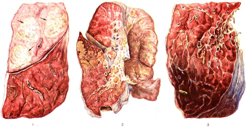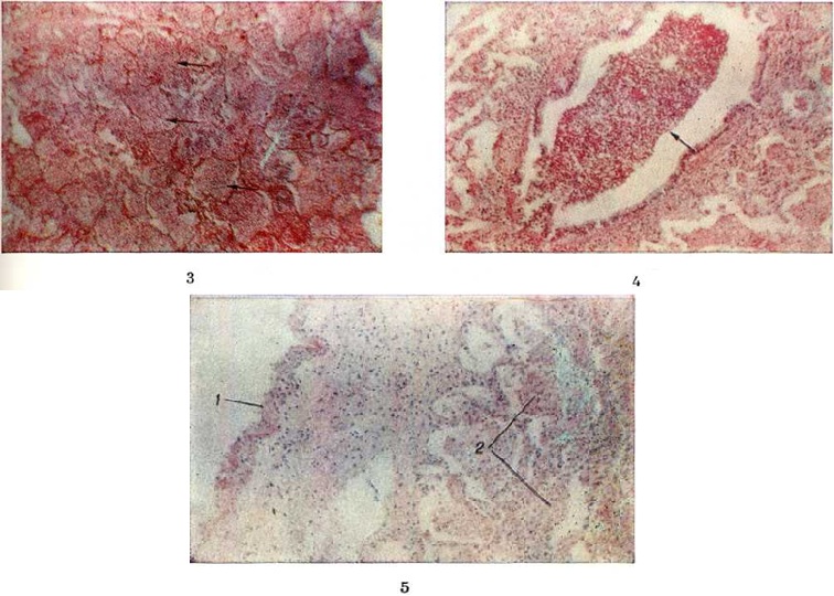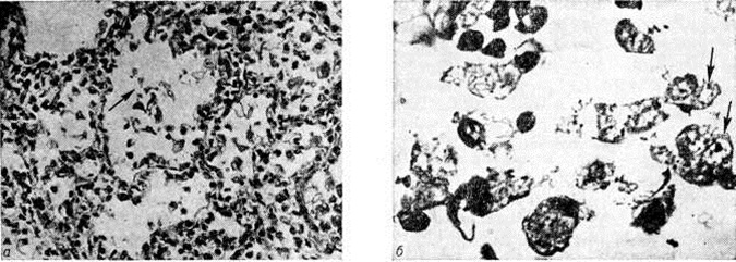 При пневмококковой Пневмония, в частности при её наиболее тяжёлом варианте — крупозной Пневмония, процесс начинается с развития небольшого очага серозного воспаления, располагающегося обычно в задних или в заднебоковых отделах лёгких, где содержатся пневмококки (рисунок 2, а). Патологический процесс распространяется прежде всего контактным путём и очень быстро захватывает значительную часть лёгкого — целую долю и даже несколько долей. Макроскопически лёгкое увеличено в объёме, его ткань резко отёчна и полнокровна. Эти изменения носят название стадии прилива. В дальнейшем в экссудате нарастает количество нейтрофильных лейкоцитов, нередко одновременно с фибрином серозно-гнойный экссудат постепенно заполняет просветы альвеол (рисунок 2,6); последние достигают при этом размеров, которые они имеют на вдохе; пневмококки в это время фагоцитируются лейкоцитами и исчезают. При прогрессировании болезни более выраженные нарушения определяются на границе с неизменённой тканью органа. На разрезе лёгкое серого цвета с мелкозернистой или гладкой поверхностью, по консистенции напоминает печень (серая гепатизация лёгкого). У больных с повышенной проницаемостью сосудов к экссудату присоединяется большое количество эритроцитов, в результате чего лёгкое приобретает серо-красный или темно-красный цвет (красная гепатизация лёгкого). В период выздоровления происходит рассасывание выпота; макроскопически в этот период лёгкие характеризуются пониженной воздушностью и эластичностью. При очаговой пневмококковой Пневмония отмечаются сходные изменения, но с меньшей степенью выраженности. Стафилококковая Пневмония имеет ряд особенностей. На ранних стадиях заболевания вокруг скоплений стафилококков появляется серозный или чаще серозно-геморрагический экссудат с небольшой примесью нейтрофильных лейкоцитов. В дальнейшем очаги воспаления приобретают характерное зональное строение. В центре их содержится много стафилококков, возникают некротические изменения (рисунок 3, а), вокруг участков некроза накапливаются лейкоциты, которые фагоцитируют стафилококки. В периферических участках пневмонического очага альвеолы содержат фибринозный или серозный экссудат, в котором нет бактерий. При тяжёлом течении болезни (стафилококковой деструкции лёгких) в местах скоплений стафилококков на значительном протяжении происходит разрушение лёгочной ткани. Макроскопически в лёгких выявляются множественные мелкие, нередко сливающиеся очаги абсцедирующей Пневмония Они красного или темно-красного 4 цвета с желтовато-серыми участками расплавления в центральной части. Позднее здесь формируются абсцессы,. принимающие иногда хронический течение. При распространении инфекционные процесса на плевру и её деструкции возникает сообщение между полостью абсцесса, бронхами и плевральной полостью, развивается пиопневмоторакс (смотри полный свод знаний). Иногда в результате деструкции стенки бронха и проникновения воздуха в интерстиций возникает интерстициальная эмфизема. Стрептококковая Пневмония имеет много общих черт со стафилококковой. Однако в тяжёлых случаях она характеризуется большей степенью некроза клеток экссудата и лёгочной ткани, а также более выраженной лимфогенной генерализацией процесса. Для Пневмония, вызванной синегнойн