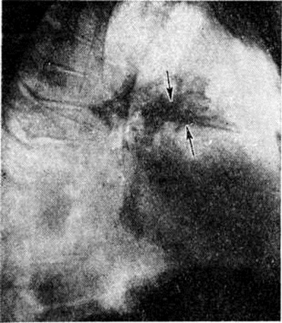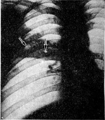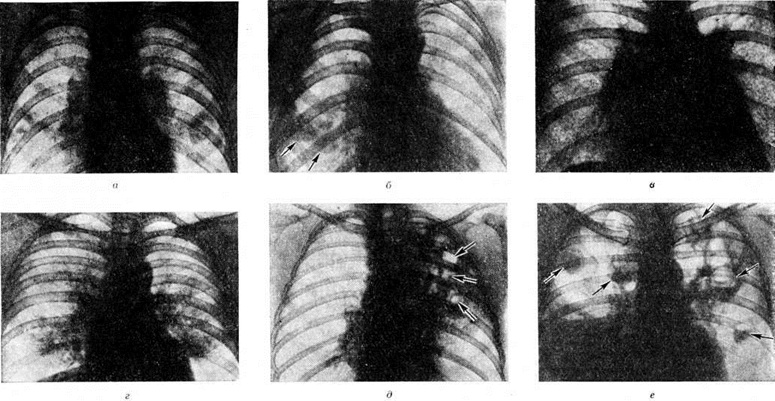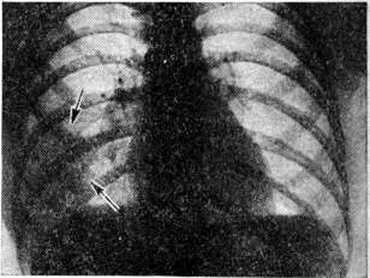 Стадия разрешения крупозной Пневмония рентгенологически проявляется снижением интенсивности тени и её фрагментацией. После рассасывания Пневмония усиление лёгочного рисунка на месте бывшего затемнения сохраняется в течение 3—4 недель В целях уточнения субстрата этого явления применяются пробы Вальсальвы и Мюллера. При проведении пробы Вальсальвы лёгочный рисунок становится беднее вследствие повышения внутрилёгочного давления и сужения сосудов; при пробе Мюллера лёгочный рисунок усиливается благодаря переполнению сосудов кровью. Лёгочный рисунок при проведении проб заметно не изменяется, если анатомическим субстратом патологический процесса является разрастание соединительной ткани, например, при пневмосклерозе. Наряду с изменениями лёгочных полей отмечается расширение и гомогенизация тени соответствующего корня лёгкого; эти изменения обычно наблюдаются в течение 3—4 недель после рассасывания воспалительных явлений в лёгочной ткани. Плевра на стороне поражения почти всегда оказывается утолщённой. В ряде случаев определяется жидкость в плевральной полости (плевропневмония); при небольшом количестве жидкости её выявлению способствует исследование больного на латероскопе в положении на больном боку (смотри полный свод знаний Полипозиционное исследование). При базальных Пневмония подвижность купола диафрагмы на стороне поражения, как правило, уменьшается. При благоприятном течении и полном рассасывании воспалительного процесса рентгенологическое картина нормализуется в среднем через 1—1,5 месяца. Среди наиболее часто встречающихся осложнений выделяют абсцедирующую Пневмония: рентгенологически на фоне затемнения выявляется одна или несколько полостей, содержащих жидкость и газ, разделённые горизонтальной границей (рисунок 7). Очаговая Пневмония рентгенологически проявляется наличием множества небольших участков затемнения, расположенных чаще всего в обоих лёгочных полях; размеры этих очаговых теней в большинстве случаев не превышают 1 сантиметров, что соответствует размерам лёгочных долек. Верхушки лёгких в большинстве случаев не поражаются. Очертания очаговых теней нечёткие, интенсивность их невелика (рисунок 8, а). Из-за наступающей гиперемии ткани лёгкого лёгочный рисунок усиливается. Тени корней лёгких расширяются и гомогенизируются. В местах наибольшей концентрации очагов отмечается реакция плевры в виде утолщения; нередко в плевральной полости выявляется выпот, большей частью в небольшом количестве. Подвижность диафрагмы часто ограничена. Для очаговой Пневмония, как и для большинства острых воспалительных процессов в лёгких, характерна быстрая динамика рентгенологическое картины: за 5—7 дней происходят существенные изменения, а через 1,5—2 недели очаги в большинстве случаев рассасываются. В связи с тем, что очаги при этом виде Пневмония возникают неодновременно, их рассасывание происходит также постепенно. В зависимости от размеров очагов принято различать 3 вида очаговой Пневмония: крупноочаговая Пневмония, при которой диаметр воспалительных фокусов равен приблизительно 1 сантиметров (встречается наиболее часто), среднеочаговые (диаметром 6— 8 миллиметров) и мелкоочаговые (диаметром 3— 5 миллиметров). Наряду с этими формами, при которых размеры очагов не превышают 1 сантимет