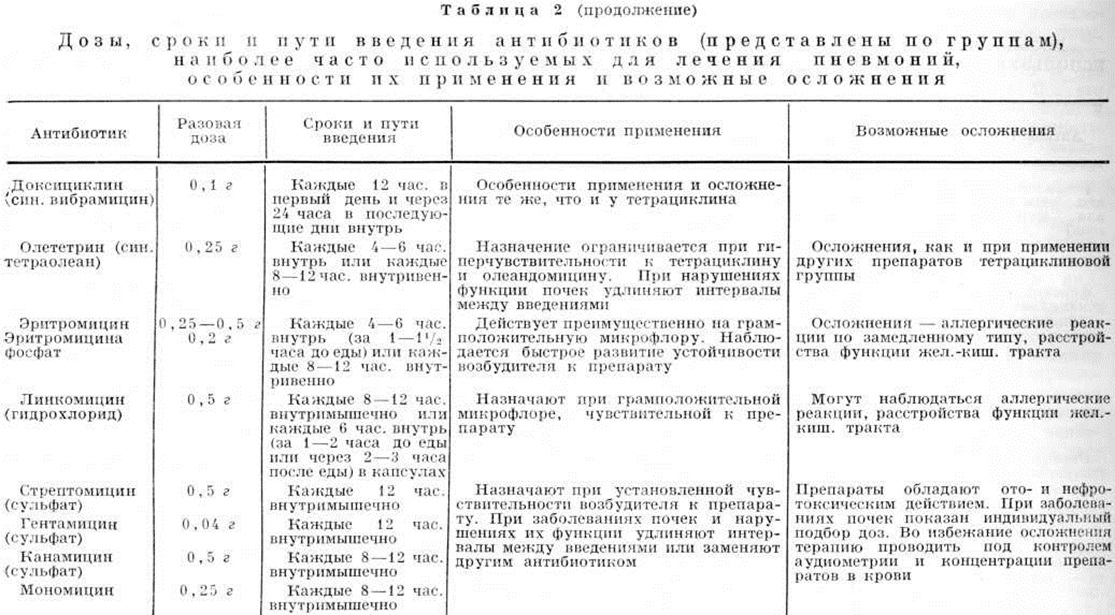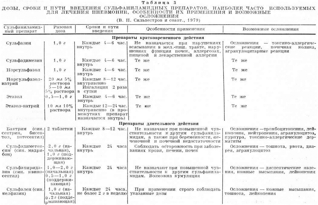 В острую фазу Пневмония рекомендуется назначать одновременно два антибиотика или один антибиотик в сочетании с сульфаниламидным препаратом. Доза и число одновременно назначаемых антибиотиков зависят от тяжести течения и распространённости процесса. В таблице 2 приведены данные о дозах, сроках и путях введения антибиотиков, наиболее часто используемых для лечения пневмоний, особенности их применения и возможные осложнения. С целью профилактики привыкания к антибактериальным средствам и уменьшения опасности аллергических реакций рекомендуется через 7—10 дней препараты менять. Вопрос о длительности антибактериальной терапии должен решаться индивидуально. Больным с крайне тяжёлым течением Пневмония, полисегментарным распространением инфильтрации рекомендуется назначение 2—3 антибактериальных средств в максимальных дозах преимущественно внутривенно. Для достижения длительного и непрерывного воздействия лекарственных средств на воспалительный процесс у больных с затяжным течением острой Пневмония применяется чрескожная катетеризация трахеи и бронхов (смотри полный свод знаний Микротрахеостомия) с введением антибиотиков, муколитических и других средств непосредственно в зону плохо рассасывающегося пневмонического очага. С той же целью можно проводить лечебно-диагностические бронхоскопии, во время которых из бронхов удаляют слизистые и гнойные пробки и промывают их растворами бронхолитических средств, протеолитических ферментов, щелочей, витаминов, гидрокортизона, а в конце процедуры вводят антибактериальные средства. При лечении больных острой Пневмония антибиотики следует сочетать с сульфаниламидными препаратами, назначение которых возможно с самого начала острой Пневмония (таблица 3). На этапе выздоровления антибиотики отменяют, оставляя сульфаниламиды. Одновременно с антибиотиками и сульфаниламидами можно применять фитонцидные препараты (ингаляции р-ров сока чеснока, лука, зверобоя и другие), наиболее целесообразные при стихании острых явлений. На этапе начинающегося выздоровления можно лечить сульфаниламидным препаратом и фитонцидами, а затем, отменив сульфаниламид, заканчивать санацию активного воспалительного процесса в лёгких фитонцидами. Антибактериальную терапию сочетают с противовоспалительными и гипосенсибилизирующими средствами, такими как ацетилсалициловая к-та, хлорид или глюконат кальция, пипольфен, супрастин. При вялом рассасывании инфильтрата и сопутствующем бронхоспазме применяют короткими курсами небольшие дозы преднизолона. Кортикостероидные препараты в больших дозах назначают больным с выраженными явлениями интоксикации и бронхиальной обструкции, с обширными инфильтративными изменениями в лёгких и при отсутствии чёткой положительной динамики от антибактериальной терапии. Основным звеном патогенетической терапии является восстановление бронхиальной проходимости и бронхиального дренажа. С этой целью при лечении всех больных острой Пневмония целесообразно применять бронхолитические, разжижающие слизь и отхаркивающие средства (эуфиллин, теофедрин, эфедрин и другие). Хорошим отхаркивающим и разжижающим слизь действием обладают раствор йодида калия, корень алтея, мукалтин, ацетилцистеин, бисольвон, термопсис, терпингидрат, лист подорожника, горячее м