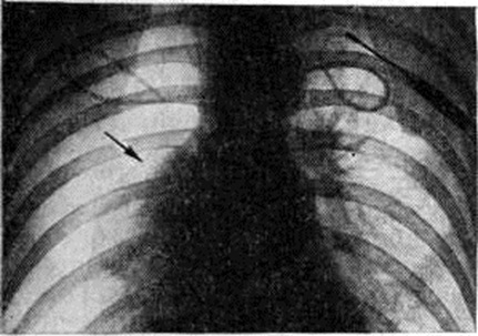 После ликвидации Пневмоторакс рентгенологическое признаки заболевания, предшествовавшего Пневмоторакс, определялись примерно у половины больных (52%), что свидетельствует о нередко бессимптомном течении патологический процесса в лёгком. Таким образом, спонтанный Пневмоторакс не менее чем в 2/3 случаев связан с хронический неспецифическими заболеваниями лёгких, протекающими с малой симптоматикой или субклинически, в основном с хронический бронхитом (смотри полный свод знаний) и эмфиземой лёгких (смотри полный свод знаний). С накоплением опыта диагностики (смотри полный свод знаний: Торакоскопия) и оперативного лечения спонтанного Пневмоторакс выяснилось, что в большинстве случаев преимущественно в верхних долях лёгких наблюдаются одиночные или множественные тонкостенные, иногда гроздевидные воздушные пузыри (буллы), расположенные под висцеральной плеврой. Буллы возникают при различных, как рубцовых, так и воспалительных процессах, ведущих к нарушению проходимости мелких бронхов, что создаёт затруднения в регионарной вентиляции лёгких и приводит к повышению давления в дистальных отделах воздухоносных путей. Тонкостенные воздушные пузыри формируются в результате разрыва перерастянутых, атрофированных межальвеолярных перегородок. Хотя конкретные причины бронхиальной обструкции, ведущей к очаговой субплевральной альвеолярной деструкции, могут быть различными, в том числе и перенесённый туберкулёз, длительное наблюдение за больными показывает, что буллы чаще всего являются проявлением диффузной эмфиземы (смотри полный свод знаний). Воздух, попадая под висцеральную плевру, может стать причиной её отслойки и образования иногда довольно больших подплевральных пузырей (блебс), а проникнув в средостение, обусловить появление медиастинальной эмфиземы. Спонтанный Пневмоторакс, осложняющий течение ряда диссеминированных процессов в лёгких (саркоидоз, гистиоцитоз X, лейомиоматоз, фиброзирующий альвеолит — болезнь Хаммена — Рича и другие), также связан с разрывом эмфизематозных булл или с нарушением целости полостных образований, являющихся проявлением исхода диффузного пневмосклероза в так называемый сотовое лёгкое. Единичные случаи врождённого семейного Пневмоторакс связывают с генетически детерминированной эмфиземой и врождённой неполноценностью висцеральной плевры. Спонтанный Пневмоторакс может быть вызван самопроизвольной перфорацией плевры при инфаркте лёгкого, солитарных или множественных кистах лёгких, ателектазе лёгкого, эозинофильном инфильтрате, абсцессе, гангрене, эхинококкозе лёгкого, силикозе. Туберкулёз лёгких, который в начале текущего столетия считали основной причиной Пневмоторакс, наблюдается не более чем в 10% случаев спонтанного Пневмоторакс У больных туберкулёзом лёгких спонтанный Пневмоторакс может возникнуть при прогрессировании туберкулёзного процесса, при ограниченных специфических изменениях, казеозной пневмонии, фиброзно-кавернозном процессе. В результате деструктивных изменений в плевре возможна перфорация субплеврально расположенного туберкулёзного очага, каверны. Кроме того, развитие спонтанного Пневмоторакс у больных туберкулёзом лёгких может произойти вследствие надрыва лёгкого натянувшимися плевральными сращениями. При эмпиеме плевры туберкулёзной