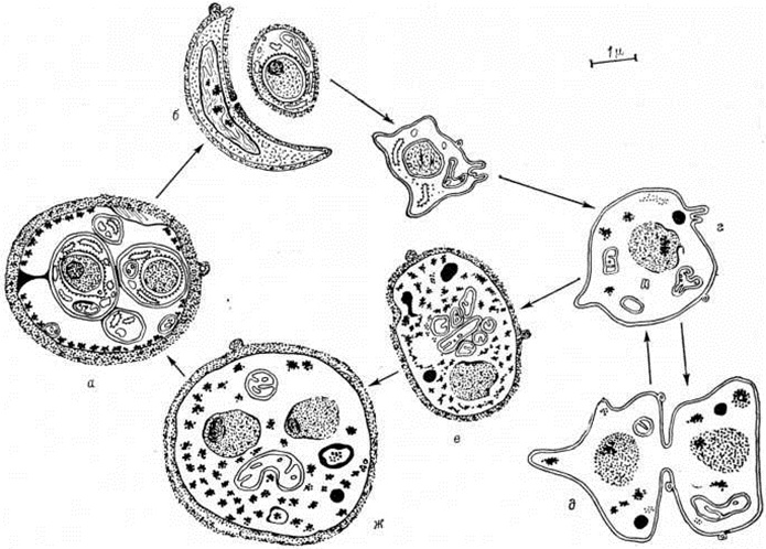 Патологическая анатомия. Макроскопически лёгкие выглядят воздушными, с очагами буллезной эмфиземы. Висцеральная плевра при этом несколько утолщена, нередко имеются пятнистые кровоизлияния. Вследствие разрыва эмфизематозных пузырей может развиться пневмомедиастинум (смотри полный свод знаний), пневмоторакс (смотри полный свод знаний). На разрезе ткань лёгких серовато-синюшная, отделяемое вязкое, скудное. Слизистая оболочка гортани, трахеи и крупных бронхов бледная, в просвете дыхательных путей пенистое содержимое. При гистологический исследовании в просвете альвеол, а иногда в межальвеолярных перегородках обнаруживается большое количество пневмоцист и белковые массы, богатые иммуноглобулинами, в альвеолах, вокруг распадающихся конгломератов паразита — макрофаги, нейтрофильные лейкоциты, эритроциты, фибрин. Строма лёгких, стенки мелких бронхов и межальвеолярные перегородки утолщены, инфильтрированы различными клеточными элементами с преобладанием плазматических и лимфоидных клеток. В цитоплазме клеток эпителия слизистой оболочки бронхов обнаруживаются макрофаги с пневмоцистами. Клиническая картина. Инкубационный период, по данным большинства исследователей, в среднем 30—40 дней, самый короткий 7— 10 дней, самый продолжительный — до 26 недель Заболевание развивается постепенно и проходит три стадии. Первая длится от нескольких дней до нескольких недель и характеризуется появлением учащённого дыхания, одышки, цианоза носогубного треугольника при сосании и крике. Ребёнок отказывается от груди, не прибавляет в весе. Испражнения могут быть жидкими, чаще не меняются. Температура — нормальная или субфебрильная, при присоединении вторичной бактериальной инфекции повышенная. Во второй стадии Пневмоцистоз клинические, картина характеризуется триадой симптомов: цианоз, одышка, тахипноэ. На 3—4-й неделе заболевания появляется сухой навязчивый кашель. Перкуторно определяется выраженный коробочный звук, увеличение нижних границ лёгких, значительно расширены межреберья. Дыхание не изменено, ослабленное или жестковатое, в паравертебральных областях определяются единичные мелкопузырчатые хрипы. Прогрессирует респираторный ацидоз (смотри полный свод знаний). Возможен разрыв лобулярных вздутий и образование пневмоторакса. Тяжёлые метаболические расстройства дополняет респираторный эксикоз (смотри полный свод знаний: Обезвоживание организма). Массивное поражение лёгких ведёт к развитию легочно-сердечной недостаточности (смотри полный свод знаний: Лёгочное сердце), увеличиваются селезёнка и печень. В третьей стадии состояние улучшается. Уменьшается одышка, исчезает кашель. Коробочный звук, определяемый перкуторно, исчезает, более чётко определяются границы сердца, прежде перекрытые эмфизематозно увеличенными лёгкими. Аускультативно хрипы не выслушиваются. У части больных встречаются явления рецидивирующего ларингита или упорного астматического синдрома. При всех стадиях Пневмоцистоз в крови возможен лимфоцитоз и моноцитоз. В острой стадии иногда наблюдается нейтрофильный лейкоцитоз; в неосложнённых случаях — РОЭ не изменена, при присоединении вторичной инфекции ускоренная. Течение Пневмоцистоз может быть волнообразным: периоды улучшения сменяются усилением одышки, кашля и других симптомов. Длит