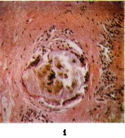 Наиболее яркий симптом Подагра— острый артрит (смотри полный свод знаний: Артриты) — развивается вследствие отложения в суставной полости уратовых микрокристаллов, способных активировать фактор Хагемана (смотри полный свод знаний: Геморрагические диатезы), компоненты комплемента, кинины, что приводит к увеличению сосудистой проницаемости (смотри полный свод знаний) и притоку нейтрофилов. Фагоцитоз кристаллов сопровождается высвобождением лизосомальных ферментов, в результате чего развивается воспаление (смотри полный свод знаний). Патогенез другого часто встречающегося клинические, проявления Подагра— поражения почек различен. В одних случаях, при развитии так называемый у ратной, или подагрической, нефропатии, основное значение имеет длительная гиперурикемия. Кристаллы уратов откладываются при этом преимущественно в интерстиции почек и канальцах. В других случаях, при развитии мочекаменной болезни (смотри полный свод знаний: Уролитиаз), патогенетическое значение имеет, прежде всего, повышенное выделение мочевой кислоты с мочой. Патологическая анатомия. При Подагра происходит отложение кристаллов уратов в суставных хрящах, эпифизах костей, околосуставных тканях, почках и других органах. Микроскопические изменения зависят от степени поражения и распространённости процесса. Отложения кристаллов инфильтрируют окружающие ткани, образуя подагрические узлы — тофусы — с развитием по периферии грануляционно-рубцовой ткани (цветной таблица, ст. 49, рисунок 1). Отложения кристаллов на поверхности суставного хряща вначале имеют вид беловатых пятен, затем суставная поверхность выглядит, как покрытая гипсом. Для гистологический исследования препараты фиксируют в абсолютном спирте или в смеси формалина и абсолютного спирта, так как кристаллы уратов растворяются в формалине. Микроскопически кристаллы уратов имеют форму прямых, кривых и S-образных тонких игл (рисунок 1) длиной до 0,06 сантиметров, которые располагаются в виде лучей, глыбок и дисков. Отложения уратов вызывают местный некроз тканей. Вокруг этого участка развивается воспалительная реакция с инфильтратом из гистиоцитов, лимфоидных, плазматических клеток и большого числа гигантских клеток, содержащих фагоцитированные кристаллы. Вокруг воспалительного инфильтрата может образовываться фиброзная капсула. Отложение уратов в синовиальной оболочке приводит к возникновению синовита (смотри полный свод знаний), длительное течение которого (хроническая Подагра) характеризуется развитием грануляционной ткани в виде паннуса, вызывающего деструкцию суставного хряща, субхондрального отдела кости и в редких случаях анкилоз сустава (смотри полный свод знаний: Анкилоз). В субхондральном отделе кости, где откладываются ураты, происходят вторичные изменения по типу микропереломов с образованием фиброзных и костных мозолей, развитием кист и остеосклероза (смотри полный свод знаний). Патологический процесс в почках при Подагра бывает двух типов. Преимущественное отложение уратов в интерстиции и эпителии канальцев приводит к развитию абактериального воспаления — пиелонефрита (смотри полный свод знаний) — и последующему склерозу почечной ткани. Второй тип поражения почек характеризуется отложением кристаллов уратов в собирательных почечных трубочках, поче
