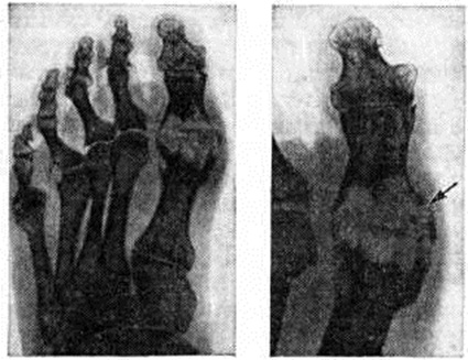 Подкожные тофусы бывают размером от нескольких миллиметров до 2—3 сантиметров и более в диаметре. Тофусы меньших размеров, если они располагаются близко к поверхности кожи, выглядят как желтовато-беловатые образования, просвечивающие сквозь кожу и иногда приподнимающие эпидермис. При более глубокой подкожной локализации тофусы имеют вид узловатых, круглых, клубневидных образований плотной, иногда хрящеподобной консистенции. Обычно тофусы безболезненны, но при обострении местного воспалительного процесса может отмечаться болезненность, размягчение тофуса, гиперемия кожных покровов над ним. Иногда целостность последних нарушается, и через образовавшийся дефект содержимое тофуса — белая пастообразная масса — выходит наружу. Размеры узла при этом уменьшаются, а в некоторых случаях он исчезает полностью. Тофусы могут иметь различную локализацию, но чаще они располагаются в области ушных раковин и разгибательной поверхности суставов. Хронический поражение почек — второе по частоте и прогностически наиболее серьёзное проявление Подагра Первый тип поражения почек — уратная, или подагрическая, нефропатия — характеризуется преимущественным поражением интерстиция и почечных канальцев и проявляется главным образом небольшой и непостоянной альбуминурией (смотри полный свод знаний: Протеинурия), цилиндрурией и лейкоцитурией, а также артериальной гипертензией (смотри полный свод знаний: Гипертензия артериальная). Особенностью подагрической нефропатии является то, что она обычно длительно протекает бессимптомно или имеет незначительную непостоянную симптоматику и прогрессирует обычно медленно. У 17—25% больных Подагра отмечается хроническая почечная недостаточность (смотри полный свод знаний). Второй тип поражения почек (и других отделов мочевой системы) характеризуется образованием уратных камней. Мочекаменная болезнь наблюдается у 10—25% больных первичной Подагра и вдвое чаще при вторичной Подагра Примерно у х/3 больных мочекаменная болезнь может предшествовать приступам артрита. Частота образования камней в мочевой системе при Подагра коррелирует с выраженностью гиперурикозурии. Мочекаменная болезнь развивается у половины больных, у которых выделение мочевой кислоты с мочой составляет 1 грамм и более в сутки. Клинические, проявления такие же, как при мочекаменной болезни другой этиологии; особенностью является частое бессимптомное течение. В отдельных случаях Подагра, главным образом у больных вторичной, развившейся на фоне гематологических заболеваний при лечении цитостатическими препаратами, и у больных первичной Подагра при резком повышении уровня мочевой кислоты, может развиваться острая почечная недостаточность. Это происходит в результате массивной преципитации кристаллов мочевой кислоты в собирательных трубочках почек и мочеточниках. Атипичное течение первичной Подагра характеризуется частыми приступами острого артрита уже на ранних стадиях болезни, быстрым развитием хронический артрита, поражением суставов верхних конечностей. Такое течение первичной подагры наблюдается относительно редко. В то же время подобное развитие болезни типично для вторичной подагры. Синдром Леша—Найхана, одним из проявлений которого является Подагра, наблюдается только у мальчиков (в возрасте от 6 ме