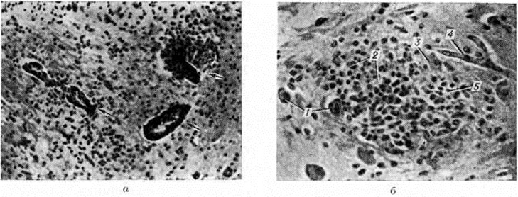 Патоморфология характеризуется развитием воспалительной реакции различной степени выраженности, обусловленной воздействием вирусов (Коксаки, ECHO и другие). При этом отмечают диффузные и очаговые изменения преимущественно в зоне мотонейронов спинного мозга. В редких случаях Полиомиелитоподобные заболевания, вызванные вирусами Коксаки В 3, В 5, В 1, ECHO и энтеровирусом 71, протекают как энцефаломиелиты с летальным исходом. Макроскопически в таких случаях обнаруживают полнокровие сосудов и отёк паутинной оболочки и вещества головного и спинного мозга. При микроскопическом исследовании, помимо резко выраженной гиперемии сосудов, выявляют диапедезные кровоизлияния, стаз и тромбы в мелких сосудах и капиллярах, инфильтрацию паутинной оболочки круглоклеточными элементами, периваскулярные инфильтраты (рисунок, а), диффузные и очаговые скопления моноцитов и нейтрофильных гранулоцитов в веществе головного и спинного мозга (рисунок, б). Инфильтраты, состоящие из этих клеток, особенно характерны для Полиомиелитоподобные заболевания; они чаще всего встречаются в передних рогах спинного мозга, нижних оливных ядрах продолговатого мозга, ядрах черепно-мозговых нервов и ретикулярной формации мозгового ствола, реже в зубчатых ядрах мозжечка, коре головного мозга и других отделах центральная нервная система В нейронах, расположенных на границе с инфильтратами, определяют хроматолиз и гиперхроматоз цитоплазмы, гиперхроматоз ядер (смотри полный свод знаний: Нервная клетка, патоморфология), нередко наблюдается отёчное изменение нейронов и цитолиз их, в капиллярах часто выявляют отёк эндотелиоцитов (рисунок, б). Нейронофагию (смотри полный свод знаний) обнаруживают редко, ей подвергаются лишь единичные нервные клетки. В спинном мозге наблюдается выпадение большого числа нейронов, местами встречаются участки полного некроза передних рогов. В головном и спинном мозге выявляют также умеренно выраженную гипертрофию астроцитов, их клазматодендроз (фрагментация отростков), пролиферацию глиальных макрофагов с образованием их палочковидных форм, гиперплазию и отёчное изменение олигодендроглиоцитов. Весь этот комплекс изменений, по данным Б. А. Ерман с соавторами (1965), расценивается как острейший энцефаломиелит. Морфологически изменения, развивающиеся в центральная нервная система при Полиомиелитоподобные заболевания, отличаются от изменений, наблюдаемых при полиомиелите, большей остротой патологический процесса и более тяжёлыми расстройствами кровообращения.