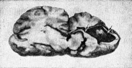 Различают истинную и ложную Порэнцефалия При истинной Порэнцефалия кисты могут сообщаться с желудочками мозга, являясь как бы их дивертикулами, иногда распространяющимися до наружной поверхности полушария головного мозга (рисунок 1). Реже кистозные полости с желудочками мозга не сообщаются. Величина кист очень вариабельна; некоторые из них иногда могут занимать половину и более половины полушария головного мозга, Внутренняя поверхность кисты чаще всего гладкая, выстлана эпендимоподобной оболочкой. Если киста сообщается с желудочками мозга, она содержит цереброспинальную жидкость, а если не сообщается — кистозную желтоватую жидкость с большим количеством белка, Микроскопически в стенке кисты выявляются участки, образованные гетеротопированной, имеющей неправильное строение корой головного мозга. В стенках кист иногда обнаруживают гемоглобиногенную пигментацию (следы очаговых кровоизлияний) и мелкие аноксические некрозы. Боковые желудочки часто имеют неправильную форму и расширены, особенно в области прилегания порэнцефалической кисты. Извилины полушарий головного мозга радиально погружены в направлении кисты, а иногда в этой области совсем отсутствуют и на их месте имеется лишь тонкая пластинка из мозгового вещества и мягкрй оболочки головного мозга, кратерообразно западающая при вскрытии полости. Гистологический изменения в ближайших к кисте извилинах головного мозга характеризуются выраженным разрежением ганглиозных клеток и неправильной ориентировкой клеточных слоев. В мягкой оболочке головного мозга отмечаются очаговые некрозы. Эти изменения указывают на раннее возникновение истинной Порэнцефалия