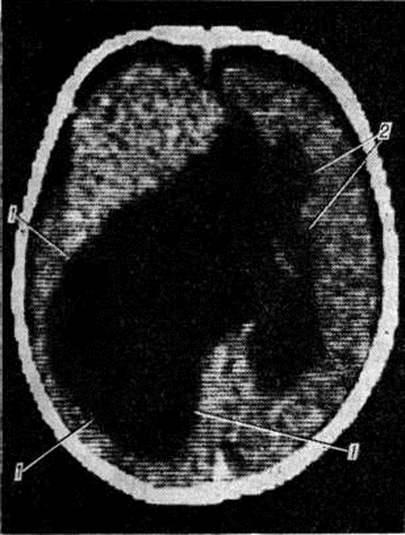 Форму и локализацию кист, особенно множественных, наиболее точно устанавливают посредством компьютерной томографии (смотри полный свод знаний: Томография компьютерная). При истинной Порэнцефалия на томограммах обнаруживают в головном мозге очаги пониженной плотности, соответствующей плотности цереброспинальной жидкости, с чёткими контурами, без явлений отёка окружающей ткани. При сообщении кистозной полости с желудочком мозга смещения его в противоположную сторону не отмечается (рисунок 4). При ложной Порэнцефалия в головном мозге выявляют очерченные кистозные полости; в случае их локализации в одном полушарии желудочки мозга нередко смещены в противоположную сторону.