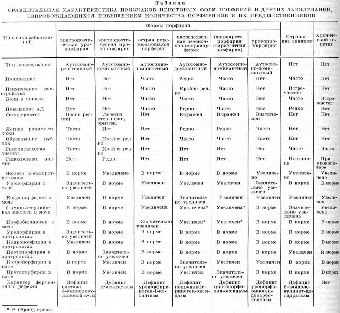Копропротопорфирия (вариегатная порфирия) встречается наиболее часто у лиц белой расы, проживающих в Южной Африке, потомков переселенцев из Голландии в 17 век Мустайоки (P. Mustajoki) в 1976 год обнаружил больных этой формой Порфирии в Финляндии. Болезнь наследуется по аутосомно-доминантному типу., В основе патогенеза лежит, по-видимому, нарушение активности фермента протопорфириноген-оксидазы, отвечающей за синтез протопорфирина: из протопорфириногена. При этом имеет место повышение синтеза β-аминолевулиновой кислоты за счёт повышения активности синтетазы β-аминолевулиновой кислоты. Заболевание характеризуется такой же неврологический симптоматикой, как при острой перемежающейся Порфирии, а также кожной симптоматикой. Кожные проявления чаще встречаются у мужчин, неврологический нарушения — у женщин. Боли в животе, неврологический расстройства возникают так же, как и при острой перемежающейся порфирии (под влиянием барбитуратов, сульфаниламидных препаратов, анальгина, гризеофульвина). Обострения болезни напоминают проявления острой перемежающейся Порфирии В отличие от острой перемежающейся формы при копропротопорфирии иногда развивается почечная недостаточность (смотри полный свод знаний). Кожные проявления такие же, как при урокопропорфирии, наблюдались у 80% лиц, проживающих в Южной Африке, а по данным Мустайоки, у лиц, проживающих в Европе, они встречаются значительно реже и выражены значительно меньше. Для копропротопорфирии характерно постоянное значительное увеличение количества протопорфирина в кале. Содержание β-аминолевулиновой кислоты и порфобилиногена в моче увеличивается в период обострения и может понижаться, иногда до нормального уровня, после уменьшения болей в животе, спада неврологический симптоматики. Лечение, профилактика и прогноз такие же, как при наследственной печёночной копропорфирии. Урокопропорфирия (синонимы поздняя кожная порфирия) — наиболее часто встречающаяся форма Порфирии в СССР. Болезнь часто наблюдается у лиц, злоупотребляющих алкогольными напитками, перенёсших гепатит, имевших дело с гепатотоксическими ядами, а также с бензином (например, у шоферов). Урокопропорфирия иногда развивается при опухоли печени. У большинства лиц с порфирией наблюдается нарушение функционального состояния печени. Эти факты позволили предположить, что урокопропорфирия — не наследственная, а приобретённая форма Порфирии Однако лишь незначительная часть лиц, злоупотребляющих алкогольными напитками, заболевает Порфирии; при тяжёлых гепатитах в моче повышается содержание копропорфирина, а не уропорфирина, тогда как при урокопропорфирии в моче увеличено в основном содержание уропорфирина при незначительном повышении уровня копропорфирина; у большинства родственников больных урокопропорфирией обнаруживается повышение содержания уропорфирина в моче и копропорфирина в кале; в нескольких семьях обнаружены 2—3 человека, страдающих урокопропорфирией, — все это говорит о наследственном предрасположении к болезни. В течение всей жизни у больных может выделяться с калом повышенное содержание порфиринов, однако при нормальном состоянии печени содержание порфиринов в коже и в моче остаётся в норме. При нарушении функции печени порфирины не выводятся в достаточном количестве в желчь, а остают
