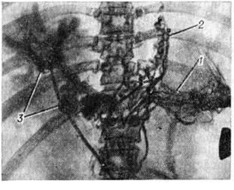 Наиболее грозным симптомом Портальная гипертензия является кровотечение из вен пищевода и желудка (смотри полный свод знаний: Желудочно-кишечное кровотечение), возникающее иногда внезапно на фоне полного благополучия. Кровотечение проявляется обильной кровавой рвотой (смотри полный свод знаний: Гематемезис), меленой (смотри полный свод знаний). Оно может рецидивировать и нередко заканчивается смертью больного. Летальность от кровотечения из вен пищевода остаётся высокой, особенно при циррозе печени (45—60%), больные погибают от острой печёночной недостаточности, развивающейся в результате кровопотери. Больные с внепечёночной Портальная гипертензия переносят кровотечение легче, летальность при этом значительно ниже (5—10%). Нередко после массивного кровотечения у больных циррозом печени впервые возникает асцит, активируется процесс в печени, ухудшается его течение. У больных с внепечёночной Портальная гипертензия асцита, как правило, не бывает. При болезни Киари асцит стойкий и превалирует над всеми другими симптомами. Длительный стойкий асцит ведёт к истощению, адинамии, развитию печёночной, почечной и сердечно-лёгочной недостаточности. При Портальная гипертензия селезёнка всегда увеличена. Размеры её варьируют в широких пределах. Нередко больные отмечают чувство тяжести и боли в левом подреберье, которые обусловлены обширными сращениями селезёнки с окружающими тканями, а также инфарктами селезёнки (смотри полный свод знаний). При кровотечении селезёнка резко сокращается, иногда перестаёт пальпироваться, а затем постепенно вновь увеличивается до прежних размеров. Спленомегалия (смотри полный свод знаний) сопровождается гиперспленизмом, часто количество тромбоцитов снижается до 80 000 — 30 000, количество лейкоцитов — до 3000—1500 в 1 микролитров крови. Наблюдается умеренная анемия, после кровотечения значительная, трудно поддающаяся лечению. Диагноз. Диагностика синдрома Портальная гипертензия и его форм часто невозможна без специальных методов исследования, из которых наиболее информативными являются рентгено-ангиографические методы (смотри полный свод знаний: Кавография, Мезентерикография, Портография, Спленопортография, Целиакография), эзофагоскопия (смотри полный свод знаний), гастроскопия (смотри полный свод знаний), спленоманометрия (смотри полный свод знаний: Селезёнка) и другие Для измерения портального давления применяют чрескожную спленоманометрию. Методика осуществляется путём пункции селезёнки и присоединения к игле аппарата Вальдмана для измерения венозного давления. При Портальная гипертензия давление в селезёнке, отражающее давление в портальной системе, достигает в среднем 350—450 миллиметров водного столба (в норме 50—115 миллиметров водного столба). Наибольшую информативность об уровне блокады портального кровообращения и состоянии сосудов даёт спленопортография. При внутрипечёночной Портальная гипертензия спленопортальное русло проходимо, расширено с резким обеднением сосудистого рисунка печени, иногда выявляются расширенные вены желудка и пищевода, расширенная пупочная вена (рисунок 4). При внепечёночной Портальная гипертензия отмечается разнообразная картина в зависимости от уровня блокады (рисунок 5), вплоть до полной непроходимости спленопортального русла. В этом случае дл