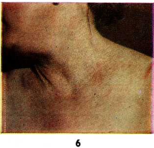Клиническая картина. Заболевание проявляется в молодом возрасте, иногда сразу после рождения. Излюбленная локализация патологический очагов на коже — боковые поверхности шеи, подмышечные и паховые области, локтевые сгибы, подколенные ямки, половые органы, реже — туловище. Кожа лица, ладоней и подошв обычно в процесс не вовлекается. Кожа в очагах поражения имеет мягковатую консистенцию, слегка приподнята над уровнем неизменённой кожи, иногда выглядит гофрированной. На этом фоне видны плоские, едва возвышающиеся, как бы вкрапленные, мягкие узелки диаметром от 1 до 5 миллиметров. Своеобразный цвет (желтоватый, как у старой слоновой кости) придаёт им сходство с ксантомами (смотри полный свод знаний: Ксантома). Узелки располагаются линейно, цепочками, нередко образуют сетчатый узор (цветной рисунок 6), иногда сливаются в сплошные бляшки с телеангиэктазиями и геморрагиями. Постепенно поражённая кожа истончается, становится дряблой, «старой». Собранная в складку кожа расправляется очень медленно. Иногда на животе появляются атрофические полосы (смотри полный свод знаний: Атрофия кожи). На слизистой оболочке рта, влагалища, прямой кишки и другие наблюдаются восковидно-желтоватые папулёзные элементы и пятнистые телеангиэктазии.