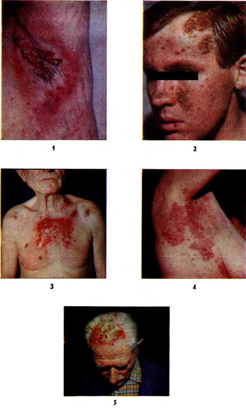 Вегетирующая пузырчатка в начале своего развития сходна с вульгарной. Заболевание часто начинается с поражения слизистой оболочки рта. Однако уже с самого начала пузыри имеют тенденцию к локализации вокруг естественных отверстий п в кожных складках (паховых областях, под молочными железами, в подмышечных ямках), а также вокруг пупка. В дальнейшем при вскрытии пузырей на поверхности эрозий развиваются папилломатозные разрастания (вегетации), покрытые сероватым налётом. Сливаясь, они образуют обширные вегетирующие поверхности (цветной рисунок 1). Симптом Никольского положительный. На слизистых оболочках вегетации редки, но на границе с кожей (область губ, носа, гениталий, ануса) встречаются часто. Регрессируя, вегетации ссыхаются, уплощаются, а эрозии эпителизируются, оставляя на коже выраженную гиперпигментацию. Заболевание протекает хронически пли подостро (злокачественно); заканчивается летально. Вегетирующую Пузырчатка весьма напоминает хроническая вегетирующая пиодермия Аллопо (смотри полный свод знаний: Пиодермия), которую иногда рассматривают как доброкачественный вариант вегетирующей Пузырчатка, что в некоторых случаях подтверждается результатами иммунофлюоресцентных исследований. Однако эта точка зрения окончательно не доказана. Листовидная пузырчатка характеризуется высыпанием на коже поверхностных, плоских, вялых пузырей с тонкой покрышкой, которая быстро разрывается и обнажает эрозии или ссыхается с образованием тонких пластинчатых чешуйкокорок, наслаивающихся друг на друга. Симптом Никольского ярко выражен и на непоражённых участках кожи. Очень быстро патологический процесс распространяется по всей поверхности кожи и принимает характер эритродермии с крупнопластинчатым шелушением. Слизистые оболочки, как правило, не поражаются. Нередко наблюдается выпадение волос и отхождение ногтей. Нарушения водного и солевого обмена менее выражены, чем при вульгарной Пузырчатка Заболевание может длиться 2—5 лет и более. Общее состояние больных на протяжении многих месяцев может оставаться удовлетворительным, но постепенно они слабеют, теряют в весе и без соответствующей терапии погибают от нарастающей кахексии или от присоединившейся инфекции. Бразильская пузырчатка — эндемическое, предположительно инфекционные заболевание, наблюдающееся в Южной Америке, главным образом в районе реки Амазонки. Возраст больных — 10— 30 лет (редко 5—6 лет). Различают листовидную, пустулёзную, буллезную, дистрофическую, эритродермическую, папилломатозную, веррукозную, герпетиформную стадии заболевания. В острых и под острых случаях отмечается повышение температуры, в хронических, кроме кожных поражений, наблюдаются анкилозы крупных суставов, атрофия мышц, молочных желёз, яичек, остеопороз (смотри полный свод знаний), остеомаляция (смотри полный свод знаний). Возможен гиперкератоз ладоней и подошв, а также поражение кожи по типу acanthosis nigricans (смотри полный свод знаний). Слизистые оболочки не поражаются. Симптом Никольского положительный. Болезнь обычно протекает хронически в течение 5—20 лет, иногда подостро или остро. Примерно половина больных погибает. Эритематозная пузырчатка начинается с образования на коже лица, чаще носа и щек (в виде бабочки), реже на волосистой части головы, очага поражения, покрытого мягким