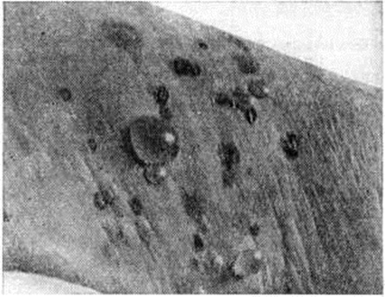 Начинается она, как правило, с поражения слизистой оболочки рта, которое может существовать изолированно на протяжении нескольких месяцев. Пузыри, быстро вскрываясь, образуют болезненные, ярко-красные или покрытые белесоватым налётом эрозии (смотри полный свод знаний), окаймлённые обрывками эпителия — остатками покрышки пузыря. Часто первичные проявления вульгарной Пузырчатка на слизистых оболочках выглядят в виде толстых, белых или сального цвета плёнок, представляющих собой покрышки абортивных пузырей. Высыпания на коже появляются исподволь, сначала в виде единичных пузырей преимущественно на коже груди и спины, затем количество их увеличивается. Пузыри располагаются на внешне неизменённой коже, наполнены прозрачным серозным содержимым, имеют различную величину. Просуществовав несколько дней, они подсыхают, покрываясь корками, или вскрываются с образованием эрозий ярко-красного цвета, обильно отделяющих густой клейкий экссудат (цветной рисунок 3). Иногда вульгарная Пузырчатка начинается с весьма ограниченного поражения кожи, так называемый пемфигозного первичного аффекта, напоминающего импетиго (смотри полный свод знаний), рак Педжета (смотри полный свод знаний: Молочная железа, опухоли) или эксфолиативный хейлит (смотри полный свод знаний). Акантолиз можно выявить путём лёгкого трения пальцами здоровой на вид кожи. При этом вблизи пузырей, а иногда и в отдалении от них происходит отслойка поверхностных слоёв эпидермиса с образованием эрозий (симптом Никольского). При потягивании за обрывки покрышки пузыря происходит отслойка верхних слоёв эпидермиса далеко за пределами видимой эрозии (краевой симптом Никольского). Акантолизом обусловлено также увеличение площади пузыря при надавливании на него пальцем (симптом Асбо-Хансена), приобретение пузырём формы груши под тяжестью экссудата, периферический рост эрозий. Общее состояние больных в начале заболевания нарушено мало. Беспокоит боль, причиняемая эрозиями, особенно сильная на слизистой оболочке рта, что затрудняет приём пищи. Постепенно состояние ухудшается, появляются слабость, субфебрильная температура. При присоединении пиогенной флоры температура может подниматься до более высоких цифр. При прогрессировании вульгарной Пузырчатка эрозии как на слизистых оболочках, так и на коже эпителизируются медленно. Характерным для вульгарной Пузырчатка является нарушение водного и особенно солевого обмена. Суточное выделение с мочой хлорида натрия резко снижено. Задержка хлорида натрия наблюдается нередко в самых ранних периодах болезни даже при изолированном поражении слизистых оболочек. При отсутствии надлежащего лечения нарастающая кахексия приводит к летальному исходу. Длительность заболевания (без лечения) — от 6 месяцев до 2 лет, у молодых больных вульгарная Пузырчатка протекает более остро. Подострая злокачественная разновидность вульгарной пузырчатки начинается с поражения слизистой оболочки рта после гриппа, ангины, удаления и протезирования зубов. Кожа поражается через 6— 12 недель Патологический процесс отличается интенсивным ростом пузырей, их слиянием, образованием обширных эрозий, по краям которых нависают белые плёнки. Симптом Никольского резко положительный. Общее состояние тяжёлое: отмечаются интоксикация, отеки, лихорадка. З