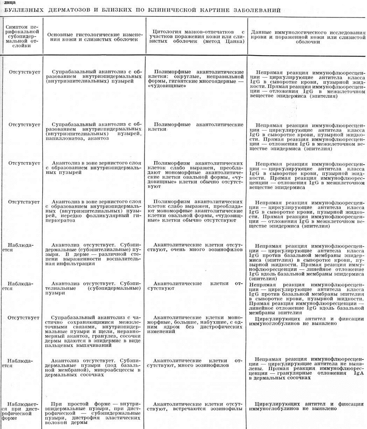 Для наружного лечения применяют тёплые ванны с перманганатом калия, антибактериальные мази или водные растворы анилиновых красителей. При поражении слизистых оболочек — обмывания и полоскания отваром ромашки пополам с 2% раствором борной кислоты, растворами буры, фурацилина и другими вяжущими и дезинфицирующими средствами. Прогноз. Наибольшая смертность больных истинной Пузырчатка наблюдается в первые 3 года от начала заболевания. Современные методы лечения позволили снизить смертность в три раза и более. Профилактика не разработана. Буллезный пемфигоид (синонимы: неакантолитическая Пузырчатка, доброкачественная хроническая Пузырчатка, старческая Пузырчатка, юношеская Пузырчатка, старческий герпетиформный дерматит, парапемфигус) чаще наблюдается у пожилых людей и детей. Иногда развивается как параонкологический дерматоз (смотри полный свод знаний). Заболевание начинается с появления на внешне неизменённой коже или на фоне эритем крупных напряжённых пузырей с серозным или серозно-геморрагическим содержимым (рисунок). Образование пузырей при буллезном пемфигоиде связано с отслоением эпидермиса от дермы и формированием полости, содержащей фибринную сетку, свернувшуюся сыворотку и клетки крови, главным образом эозинофилы. У некоторых больных первичным проявлением буллезного пемфигоида могут быть элементы, типичные для многоформной экссудативной эритемы (смотри полный свод знаний: Эритема экссудативная многоформная). При вскрытии пузырей образуются эрозии, характеризующиеся, в отличие от Пузырчатка, отсутствием периферического роста и выраженной тенденцией к заживлению. По мере прогрессирования болезни количество пузырей увеличивается, преимущественно на сгибах и в складках тела. Примерно в 30% случаев в процесс вовлекается слизистая оболочка рта, а у 10% больных он начинается с её поражения. Симптом Никольского отрицательный, однако при потягивании за обрывки покрышки пузыря выявляется симптом перифокальной субэпидермальной отслойки. Перифокальную отслойку эпидермиса можно наблюдать также при надавливании на пузырь. Последний при этом сплющивается и расширяется (симптом Асбо-Хансена). Заболевание отличается хронически-рецидивирующим доброкачественным течением. Диагноз устанавливают на основании клинические, гистологический и иммунологический исследований. При электронно-микроскопическом исследовании наблюдают расслоение базальной мембраны: дном пузыря при буллезном пемфигоиде является электронно-плотная зона собственно базальной мембраны. С помощью непрямой реакции иммунофлюоресценции примерно у 2/3 больных буллезным пемфигоидом выявляют циркулирующие антитела класса IgG против базальной мембраны в сыворотке крови и пузырной жидкости. Прямая реакция иммунофлюоресценции выявляет линейное отложение иммуноглобулинов класса G вдоль базальной мембраны как в поражённой, так и здоровой на вид коже. На основании электронно-микроскопических и иммунологических исследований как вариант буллезного пемфигоида рассматривают герпес беременных (смотри полный свод знаний: Герпес). Лечение больных буллезным пемфигоидом аналогично лечению больных истинной Пузырчатка, но поддерживающая кортикостероидная терапия не является необходимой. Прогноз для жизни благоприятный. Профилактика не разработ