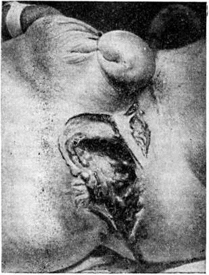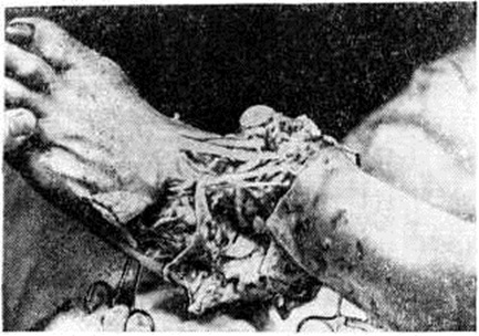 Рваная рана образуется при воздействии повреждающего фактора на мягкие ткани, превышающего физическую способность их к растяжению. Края её неправильной формы, отмечается отслойка или отрыв тканей (рисунок 1) и разрушение тканевых элементов на значительном протяжении. В отдельную группу выделяют так называемый скальпированные раны (смотри полный свод знаний: Скальпирование), характеризующиеся полной или частичной отслойкой кожи (а на волосистой части головы — почти всех мягких тканей) от подлежащих тканей без существенного их повреждения. Такие раны возникают при попадании длинных волос в движущиеся механизмы (валки, шестерни) станков и других машин, конечностей во вращающиеся механизмы, под колеса транспорта. Эти раны обычно обильно загрязнены землёй, смазочными маслами, промышленной пылью и инородными телами. Патогенез