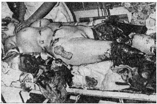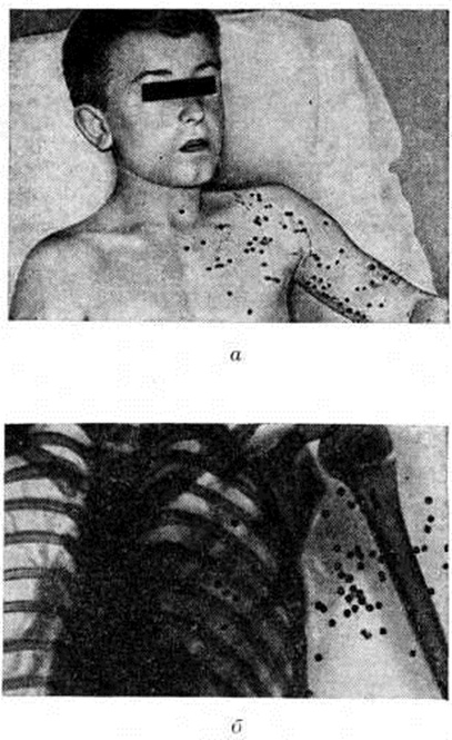 Ушибленная рана (цветной рисунок 3), возникающая от удара тупым предметом, как и размозжённая рана, при которой наблюдается раздавливание и разрыв тканей, имеют обширную зону первичного и особенно вторичного травматического некроза с обильным микробным загрязнением. Иногда под действием большой силы, вызывающей разрыв и размозжение тканей (рисунок 2,3), происходит полное отделение сегмента конечности, так называемый травматический отрыв (цветной рисунок 4), существенной особенностью к-рога является отрыв кожного покрова выше уровня разъединения глубжележащих тканей. Укушенная рана возникает вследствие укуса животным или человеком, отличается обильным микробным загрязнением и частыми инфекционные осложнениями. При укусе животным может произойти заражение вирусом бешенства (смотри полный свод знаний). Огнестрельные раны возникают в результате воздействия огнестрельного снаряда. При этом повреждение характеризуется сложной структурой, обширной зоной первичного и вторичного травматического некроза, развитием различных осложнений (смотри полный свод знаний: ниже «Особенности ранений военного времени. Этапное лечение»). Многообразие систем огнестрельного оружия и боеприпасов обусловливает большое разнообразие огнестрельных ран, при классификации которых, помимо морфологический признаков, свойственных всем ранам, учитывается и вид ранящего снаряда. Так, различают пулевые, осколочные ранения (цветной рисунок 5, 6) и ранения дробью (рисунок 4). Для огнестрельных ранений отдельных анатомических областей и органов тела (например, груди, живота, таза, суставов и другие) разработаны частные классификации. Кроме того, различают раны касательные, слепые и сквозные; проникающие и непроникающие; с повреждением и без повреждения внутренних органов; одиночные, множественные и сочетанные; асептические, гнойные инфицированные; отравленные; комбинированные. При касательном ранении образовавшийся раневой канал лишён одной стенки. При слепом ранении раневой канал не имеет выходного отверстия и заканчивается в тканях; при сквозном ранении имеются входное и выходное отверстия. Проникающим называется ранение, при котором ранящий предмет попадает в какую-либо полость человеческого тела (плевральную, брюшную, суставную, полость черепа, камеры глаза, придаточные пазухи носа и другие) при условии прободения им всей толщи стенки соответствующей полости, включая париетальный листок плевры, брюшины и другие Множественное ранение возникает при повреждении двух и более органов (областей тела), несколькими поражающими агентами одного и того же вида оружия (например, ранение верхней и нижней конечностей двумя пулями). При сочетанном ранении имеет место повреждение двух и более смежных анатомических областей или органов, обусловленное одиночным поражающим агентом (например, пулевое ранение желудка и селезёнки). При комбинированных ранениях рана возникает в результате действия механического фактора в различных комбинациях с другими поражающими факторами современного оружия — термическим, радиационным, химическим, бактериологическим. Учитывая поражение несколькими факторами, термин «комбинированные ранения» вышел из употребления и заменён соответствующим термином — комбинированные поражения (смотри полный свод знаний). К асеп