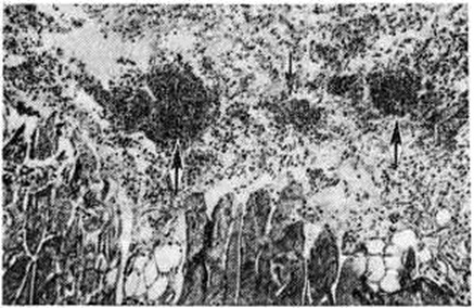 Морфологически в первой фазе раневого процесса — фазе воспаления (смотри полный свод знаний) — происходит расплавление некротизированных тканей и их удаление, то есть очищение раны. В первом периоде этой фазы (период сосудистых изменений) наблюдается спазм сосудов в области раны, сменяемый паралитическим их расширением, повышением проницаемости сосудистой стенки и быстро нарастающим отёком, который получил название травматического и рассматривался Н. И. Пироговым как нормальная местная реакция живой ткани на травму. Травматический отёк характеризуется наличием свободной прозрачной жидкости в межклеточных пространствах и полостях (собственно отёк), а также набуханием тканей вследствие повышения гидрофильности их коллоидов. Развивающиеся под влиянием распада погибших тканей местное нарушение обмена веществ — ацидоз (смотри полный свод знаний), изменение состояния коллоидов, повышение осмотического давления (смотри полный свод знаний), уменьшение поверхностного натяжения (смотри полный свод знаний) способствуют прогрессированию травматического отёка, в результате которого просвет раневого канала суживается или даже исчезает, а часть его содержимого, то есть омертвевшие пропитанные кровью ткани выдавливаются наружу (так называемый первичное очищение раны). Во втором периоде фазы воспаления происходит полное (так называемый вторичное, или биологическое) очищение раны, осуществляемое в результате воспалительной реакции. При обилии некротических тканей и микрофлоры экссудативно-пролиферативные процессы в ране развиваются в виде гнойно-демаркационного воспаления, благодаря которому обеспечивается расплавление и отторжение мёртвого субстрата. В процессе гнойно-демаркационного воспаления происходит обильная экссудация белков плазмы, активация её протеолитической активности и тканевого протеолиза в области раны, обильная миграция лейкоцитов в ткани. Все это обусловливает активное расщепление мёртвого субстрата, его расплавление и отторжение. В раннем периоде воспаления в экссудате (смотри полный свод знаний) преобладают нейтрофильные лейкоциты (смотри полный свод знаний), позже к ним присоединяются лимфоциты и макрофаги (смотри полный свод знаний). Лизис мёртвых тканей осуществляется как путём их фагоцитоза (смотри полный свод знаний) и внутриклеточного переваривания с последующей гибелью самих фагоцитов, так и посредством внеклеточного протеолиза, осуществляемого лейкоцитами. Макрофаги, помимо фагоцитоза, участвуют в сложной цепи иммунологический реакций организма, во многом определяющих течение раневого процесса. В лизировании омертвевших тканей важную роль играет микрофлора, являющаяся, по выражению И. В. Давыдовского, как бы биологический очистителем раны. В результате воспалительной реакции формируется демаркационный вал, отграничивающий жизнеспособные ткани от омертвевших. Период вторичного очищения раны, протекающий в виде её нагноения, заканчивается исчезновением мёртвого субстрата и началом формирования грануляционной ткани. Вслед за процессом демаркации наступает вторая фаза раневого процесса — фаза регенерации, характеризующаяся развитием грануляционной ткани (смотри полный свод знаний), которая начинает формироваться в виде отдельных очагов на дне и стенках раны и посте