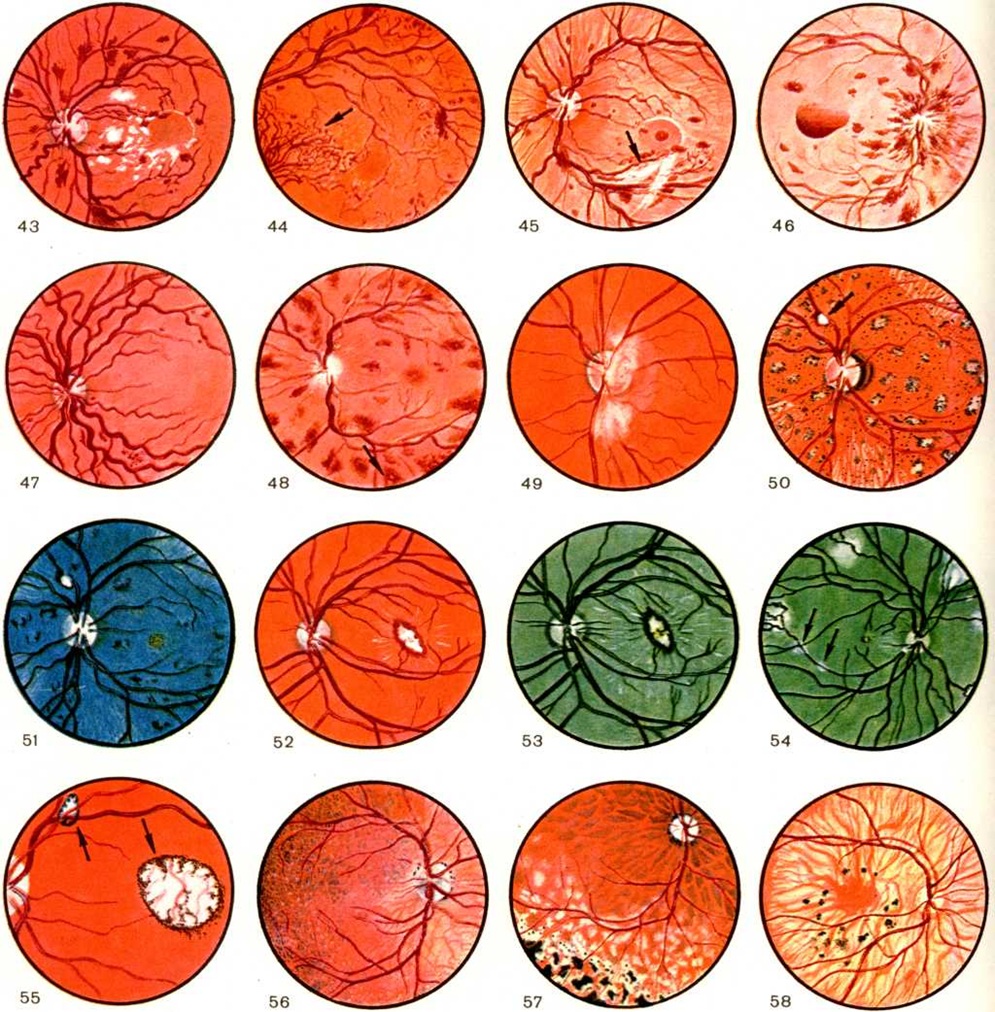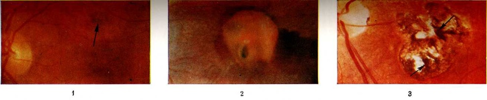 В диагностике и дифференциальной диагностике Ретинит важное значение имеют данные офтальмоскопического исследования (смотри полный свод знаний: Офтальмоскопия) и флюоресцентной ангиографии глазного дна (смотри полный свод знаний: Флюоресцентная ангиография). С помощью этих методов может быть выявлен свежий воспалительный фокус (контрастируется в поздние сроки) или старый фокус с деструкцией пигментного эпителия (контрастируется в ранние сроки). Этиологию Ретинит устанавливают на основании оценки состояния больного, данных общего его обследования, постановки специальных диагностических проб. Отдельные формы ретинита Туберкулёзный ретинит чаще всего развивается при неактивных формах туберкулёза. Несмотря на то, что в клинике наблюдаются туберкулы сетчатки и картина экссудативного туберкулёзного Ретинит, туберкулёз сетчатки следует считать вторичным по отношению к туберкулёзному поражению сосудистой оболочки глазного яблока. Поэтому правильнее говорить о туберкулёзном хориоретините, а также о туберкулёзном васкулите, следующих за воспалением ресничного тела (смотри полный свод знаний) или собственно сосудистой оболочки. Туберкулёзный Ретинит проявляется в форме конглобированного туберкула. В начальной фазе развития — это очаг серовато-белого цвета с нечёткими границами (цветной табл., ст. 272, рисунок 1). Затем туберкул постепенно растёт и принимает вид опухоли белого или желтоватого цвета, проминирующей в стекловидное тело. По краям туберкула располагаются мелкие экссудативные очажки. На поверхности туберкула возникают небольшие кровоизлияния, сетчатка натягивается, образует складки, что может привести к её отслойке (смотри полный свод знаний: Отслойка сетчатки). Распространённой формой туберкулёзного поражения глазного дна являются милиарный хориоретинит и диссеминированный туберкулёзный хориоретинит (смотри цветной рисунок 50—54). Туберкулёзные поражения, вызывающие изменения венозных и артериальных сосудов сетчатки, дают картину перифлебита и периартериита. Офтальмоскопически на сосудах определяются «муфты» или экссудативные отложения в виде отдельных мелких пятен. Около поражённых сосудов бывают видны мелкие кровоизлияния. Перифлебиты часто осложняются рецидивирующими кровоизлияниями в стекловидное тело, приводящими к резкому понижению зрения. При локализации туберкулёзного фокуса около диска зрительного нерва возникает нейроретинит (синонимы: циркумпапиллярный ретинит, перипапиллярный хориоретинит Йенсена, околососочковый нейроретинит Йенсена, юкстапапиллярный ретинохориоидит Йенсена). При этом в воспалительный процесс вовлекается соответствующая часть диска зрительного нерва. Нейроретинит не патогномоничен для туберкулёза. Он встречается также при токсоплазмозе, вирусных поражениях и сифилисе. Туберкулёзный процесс в области диска зрительного нерва, захватывая собственно сосудистую оболочку, может давать картину так называемый «географического» хориоретинита, сопровождаясь очаговой атрофией сосудистой оболочки глаза, развитием субретинальной неоваскуляризации. Лечение туберкулёзного Ретинит должно быть комплексным и согласовано с фтизиатрами. Показана местная и общая специфическая терапия (смотри полный свод знаний: Туберкулез), в исходе заболевания используют 