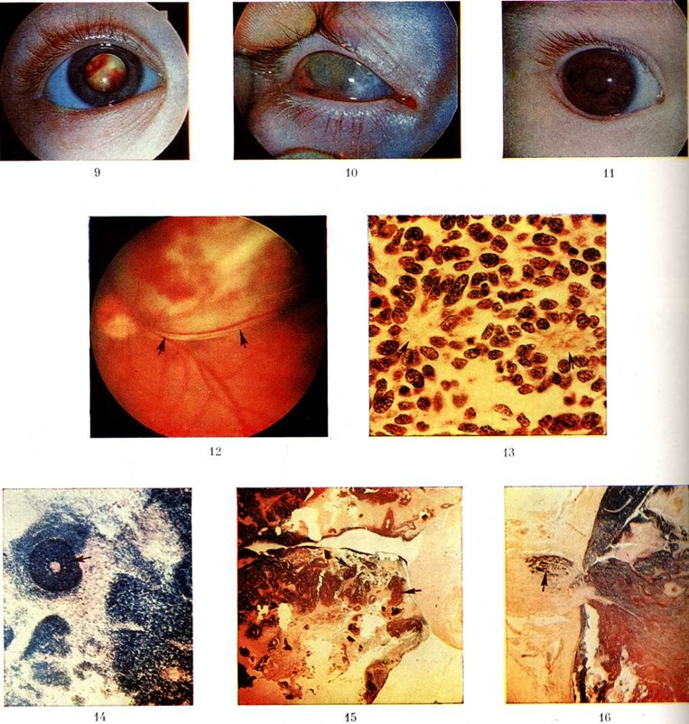 Ранним клинические, признаком односторонней Ретинобластома является косоглазие (смотри полный свод знаний), двусторонней — нистагм (смотри полный свод знаний). Лейкокория, или так называемый амавротический кошачий глаз, проявляющийся расширением зрачка и жёлтым. его свечением в результате отражения света опухолевыми массами, расположенными в стекловидном теле, относится к поздним признакам заболевания, когда уже большая часть глазного яблока заполнена опухолевыми массами (цветной рисунок 9).
