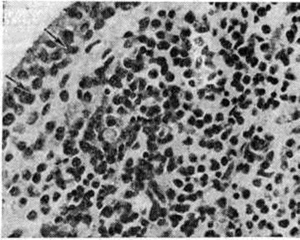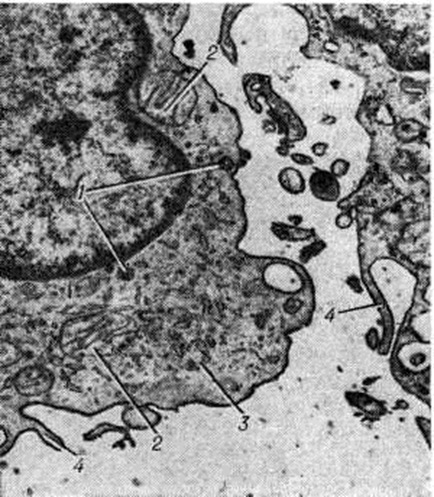 Патологическая анатомия. Для Ревматоидный артрит характерно вовлечение в патологический процесс многих органов и систем, но преимущественно поражаются суставы. В основе тканевых повреждений при этом заболевании лежит иммунное воспаление, выражающееся в форме гиперчувствительности немедленного и замедленного типа. Включение факторов гуморальной аллергии (смотри полный свод знаний) подтверждается признаками резкого усиления сосудистой проницаемости, присутствием в участках поражения иммуноглобулинов и комплемента, полиморфно-ядерных лейкоцитов, плазмобластов, пролиферативно-деструктивным характером васкулита. Морфологически выражением клеточной гиперчувствительности является наличие большого числа бластных форм Т-лимфоцитов (смотри полный свод знаний: И мму некомпетентные клетки) и макрофагов (смотри полный свод знаний) с признаками интенсивно протекающего фагоцитоза (смотри полный свод знаний) в поражённых тканях. В развитии тканевых и органных повреждений при Ревматоидный артрит ведущую роль играют микроциркуляторные нарушения и лизосомные ферменты. В суставах при развёрнутой клинические, картине заболевания обнаруживается ворсинчатое разрастание синовиальной оболочки (рисунок 1), в части случаев наползающей в виде паннуса на поверхность суставного хряща. При этом в суставном хряще определяются эрозии, трещины, щели; его остатки сухие и зернистые на вид. В суставных полостях обнаруживается увеличенное количество вязкой мутной синовиальной жидкости, постоянно отмечается утолщение и склероз суставной капсулы, имеются фиброзные спайки. Полная облитерация суставной полости спайками ведёт к развитию фиброзного анкилоза (смотри полный свод знаний). Пролиферация остеоидной ткани сопровождается развитием остеофитов (смотри полный свод знаний) и костных анкилозов. В гистологический картине синовита выделяют следующие изменения: 1) поражение сосудов микроциркуляторного русла; 2) гиперплазию и гипертрофию синовиальных клеток; 3) воспалительную клеточную инфильтрацию; 4) разрастание грануляционной ткани, склероз, липоматоз синовиальной собственной пластинки. Повышается проницаемость стенок сосудов микроциркуляторного русла, сопровождающаяся выходом фибринозного экссудата и образованием очагов фибриноида в синовиальной собственной пластинке и фибриноподобных наложений на поверхности синовиальной оболочки. Иммуноморфологически в очагах фибриноида и в фибриноподобных наложениях выявляются фибрин, иммуноглобулины (G, А, М) и С3-фракция комплемента. При обострении воспаления постоянно отмечается продуктивный или продуктивно-деструктивный васкулит с фиксацией в сосудистой стенке иммуноглобулинов и комплемента. В глубоких слоях синовиальной оболочки (смотри полный свод знаний) изредка определяются ревматоидные узелки — небольшие участки фибриноидного некроза, окружённые макрофагами и лимфоцитами. В 80% случаев встречается гиперплазия и гипертрофия синовиоцитов с характерным палисадообразным их расположением (рисунок 2). С помощью электронно-микроскопического исследования обнаружено, что гипертрофия синовиоцитов происходит за счёт гиперплазии их органелл, особенно зернистой эндоплазматической сети, полисом, аппарата Гольджи и лизосом (рисунок 3). В гиперплазии ворсинчатого слоя синовиал
