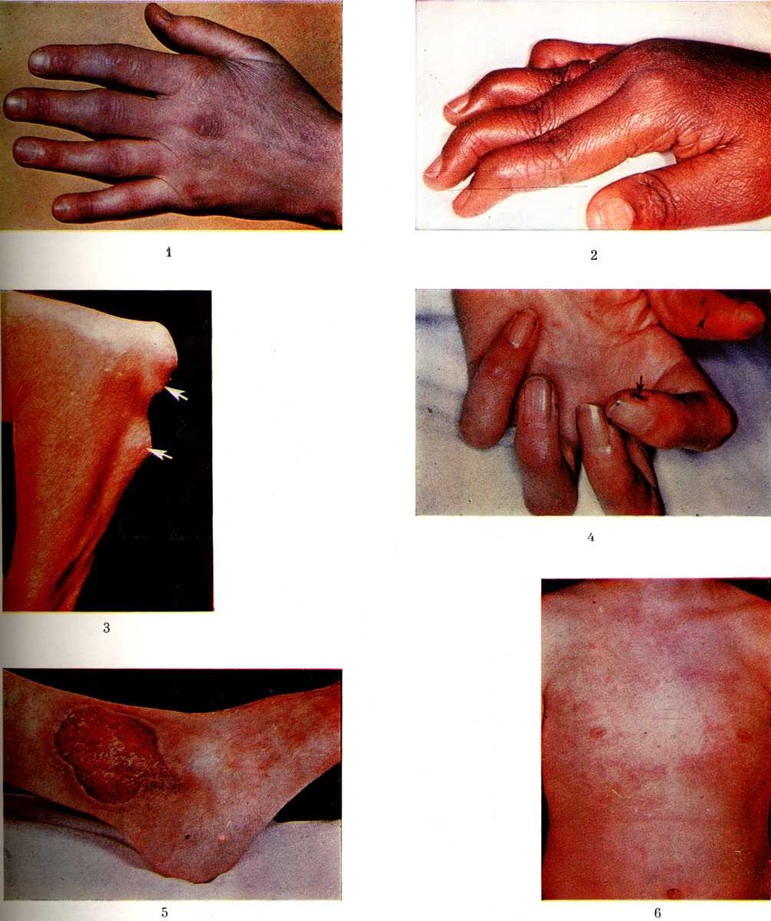 В дальнейшем присоединяется сужение суставных щелей, эрозии костей, подвывихи и вывихи (рисунок 7, 8). Часто на фоне описанных изменений на краях суставных поверхностей формируются остеофиты — проявление вторичного артроза. Тяжёлое ревматоидное поражение суставов может приводить к их анкилозированию; в случаях особо неблагоприятного течения возможен остеолиз ближайших к суставам отделов костей (рисунок 9). Как редкие рентгенологическое симптомы встречаются периоститы (смотри полный свод знаний), асептические остеонекрозы (смотри полный свод знаний: Остеохондропатия). На основании рентгенологическое изменений суставов выделяют стадии Ревматоидный артрит Из многочисленных схем наиболее известна схема Стайнброккера, согласно которой выделяют 4 стадии ревматоидного артрита. К 1-й стадии относят случаи с околосуставным остеопорозом (смотри полный свод знаний), но без сужения суставных щелей и эрозии костей. Если к остеопорозу присоединяется сужение суставных щелей, то это соответствует 2-й стадии. Наличие эрозий костей указывает на 3-ю стадию, а костного анкилоза — на 4-ю стадию. Ларсен (A. Larsen, 1974) предложил более детализированную оценку, выделив 6 стадий, и дал для каждого сустава отдельную схему, отражающую местные особенности проявлений Ревматоидный артрит Дифференциальная диагностика представляет трудности обычно лишь на ранних стадиях ; Ревматоидный артрит при отсутствии рентгенологическое признаков эрозивного артрита и ревматоидных факторов в сыворотке крови. Чаще всего дифференциальный диагноз проводят с некоторыми вариантами таких заболеваний, как болезнь Бехтерева, болезнь Рейтера, псориатический артрит, остеоартроз, подагра (смотри полный свод знаний). Поражение периферических суставов при болезни Бехтерева (смотри полный свод знаний: Бехтерева болезнь) в ряде случаев, однако, слабовыраженные (требующие целенаправленного поиска) или кратковременные. Поражение суставов при псориатическом артрите (смотри полный свод знаний: Артриты), как правило, отличается от Ревматоидный артрит несимметричностью, наличием периартикулярного отёка, вовлечением в процесс дистальных межфаланговых суставов кистей. Важное значение имеет обнаружение типичных изменении кожи. Однако они могут быть непостоянными, небольшими по размерам и локализоваться, например, только на волосистой части головы или ногтях, что при недостаточно внимательном осмотре может привести к диагностической ошибке. Вторичный синовит при деформирующем остеоартрозе (смотри полный свод знаний: Артрозы) с преимущественным поражением суставов кистей отличается от Ревматоидный артрит тем, что возникает только в тех суставах, которые наиболее часто вовлекаются в процесс именно при остеоартрозе (дистальных, реже проксимальных межфаланговых), и практически не встречается в пястно-фаланговых суставах, как правило страдающих Ревматоидный артрит, а также отсутствием ревматоидных факторов. Лечение. Существует большое количество различных методов лечения Ревматоидный артрит, выбор которых зависит от формы болезни, степени её активности, течения, характера изменений суставов, внесуставных проявлений и других факторов. Основное значение в лечении имеют лекарственные средства. При отсутствии клинические, признаков внесуставных проявлений лечение, как