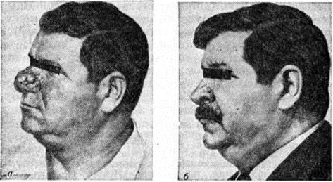 При гладком течении послеоперационного периода нормальная конфигурация носа обычно восстанавливается (рисунок 1, б). Рецидивы Ринофима возможны при неполном удалении поражённых тканей.